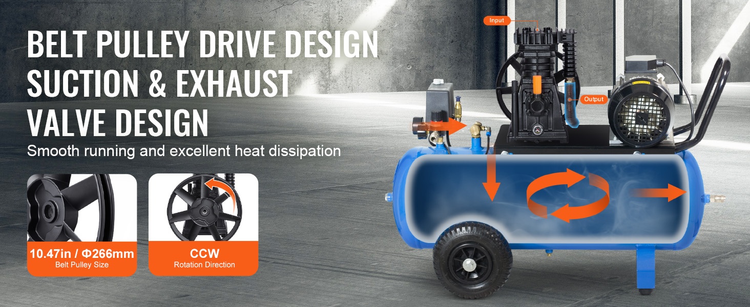 Öljyvoideltu mäntäkompressoripää käyttää hihnakäyttöä, joka tukee tehokasta kompressiota ja pehmeää käyntiä. Rakenne parantaa lämmönpoistoa, pidentää käyttöikää ja auttaa säilyttämään suorituskyvyn pitkällä aikavälillä.