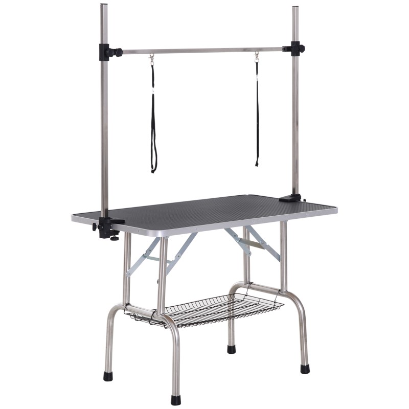Korkeussäädettävä trimmauspöytä koirille ja kissoille, taittuvat jalat, alakori, liukumaton musta taso, enimmäiskuormitus 100 kg