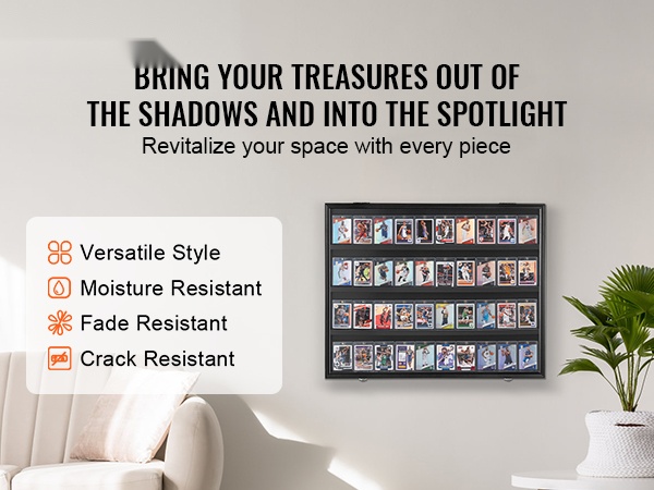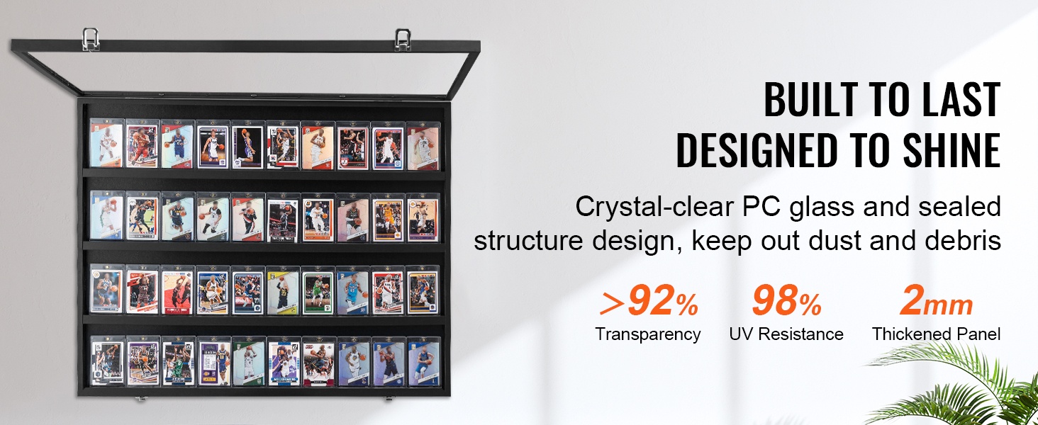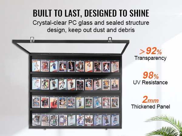 Tyylikäs korttikehys 36 luokitellulle urheilukortille. Kestävä puukehys ja kirkas, 98 % UV-suojattu PC-lasi suojaavat kokoelmaasi haalistumiselta ja vaurioilta. Neljä hyllyä pitävät kortit esillä siistissä järjestyksessä, ja lukittava seinäkaappi auttaa pitämään arvokkkaan kokoelman turvassa.