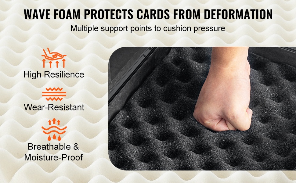 Kannen aaltoileva vaahtomuovi tarjoaa useita tukipisteitä, jotka pehmentävät painetta ja auttavat estämään korttien vääntymistä ja kulumista. Korkean kimmoisuuden vaahtomuovi on hengittävää ja kosteutta hylkivää, joten kortit pysyvät hyväkuntoisina pitkään.