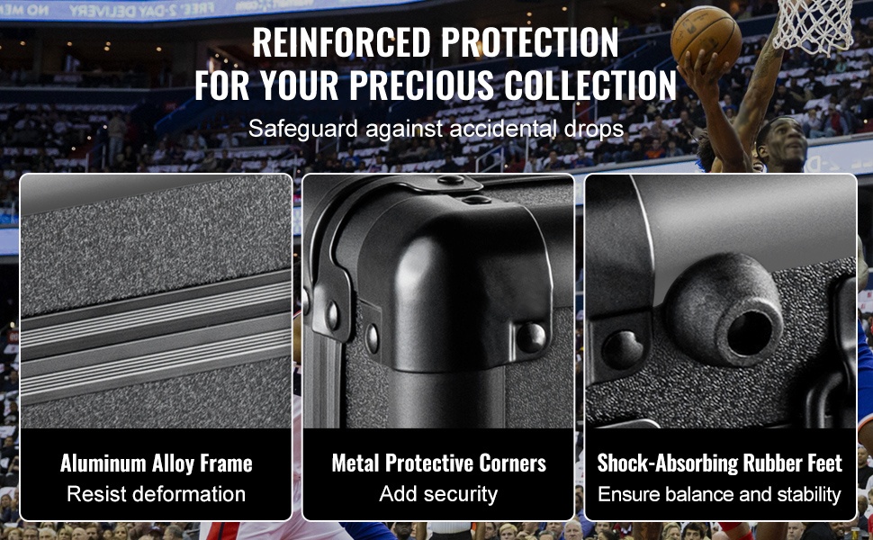 Alumiiniseosrunko ja vahvistetut metallikulmat suojaavat koteloa kolhuilta ja iskuilta ja pidentävät sen käyttöikää. Pohjassa olevat kumijalat vaimentavat tärinää ja estävät koteloa liukumasta, mikä antaa lisäsuojaa arvokkaalle korttikokoelmallesi.