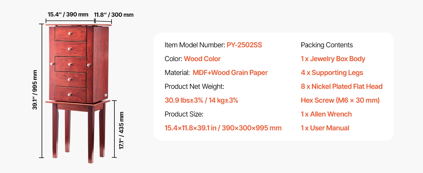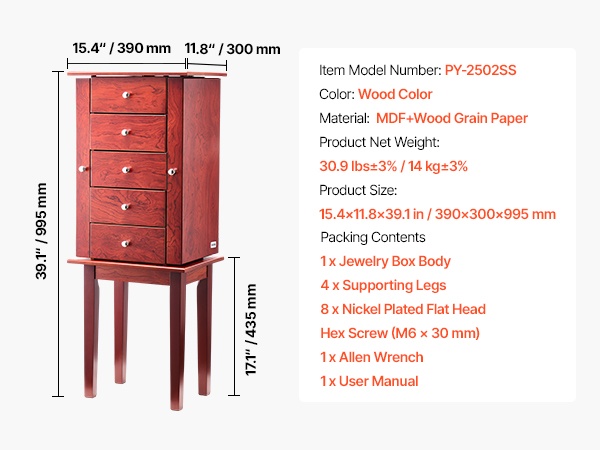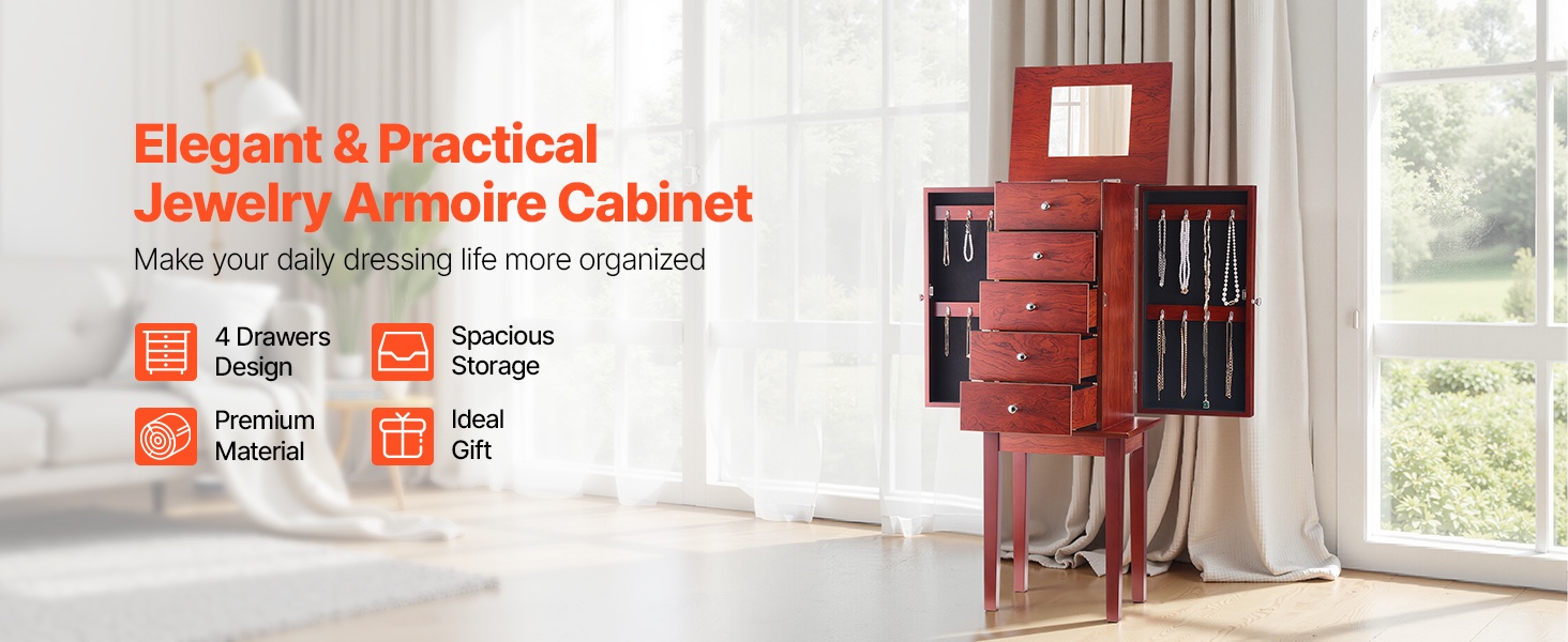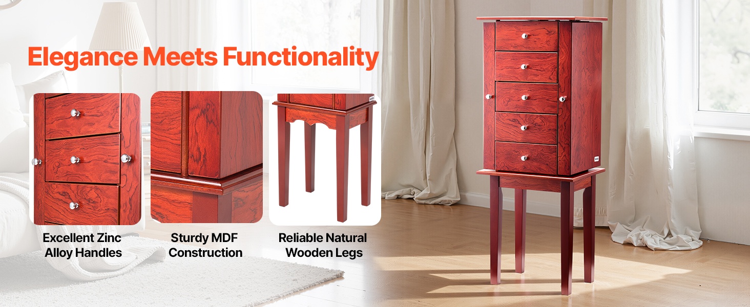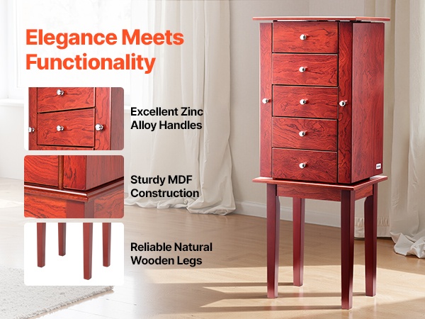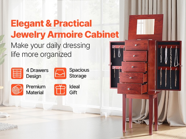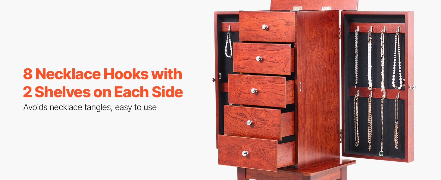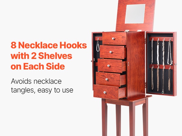 Tämä vapaasti seisova korukaappi tarjoaa runsaasti järjestettyä säilytystilaa renkaiden, korvakorujen, rannekorujen ja kaulakorujen säilyttämiseen. Koukut ja erilliset lokerot pitävät korut siisteinä ja suojaavat niitä pölyltä ja vaurioilta. Ajaton puunsävyinen ulkoasu sopii monenlaiseen sisustukseen.