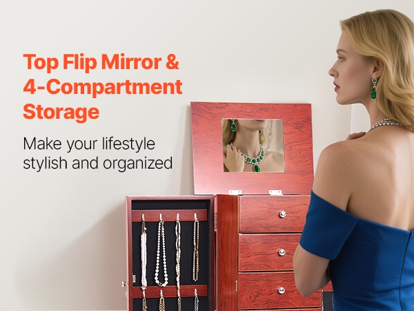Kannen alta paljastuva peili helpottaa korujen sovittamista. Yläosan jaettu tarjotin sisältää muun muassa sormuspaikat ja pienet lokerot, joihin voi lajitella pienet korut ja arvoesineet omiin osioihinsa.