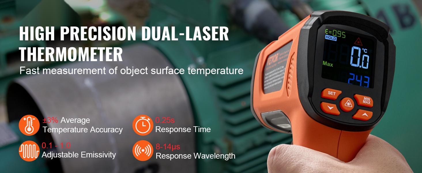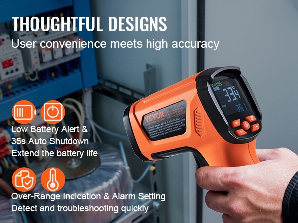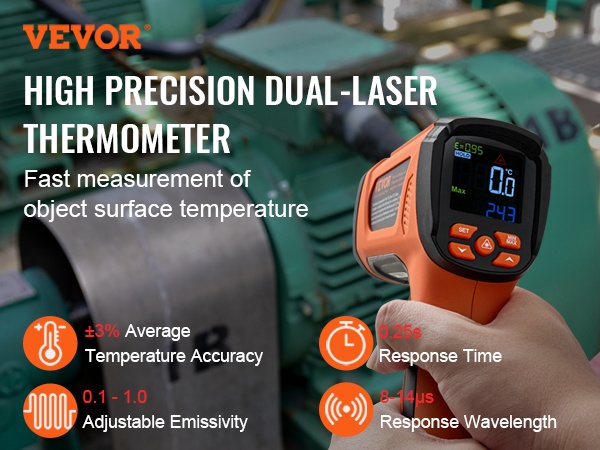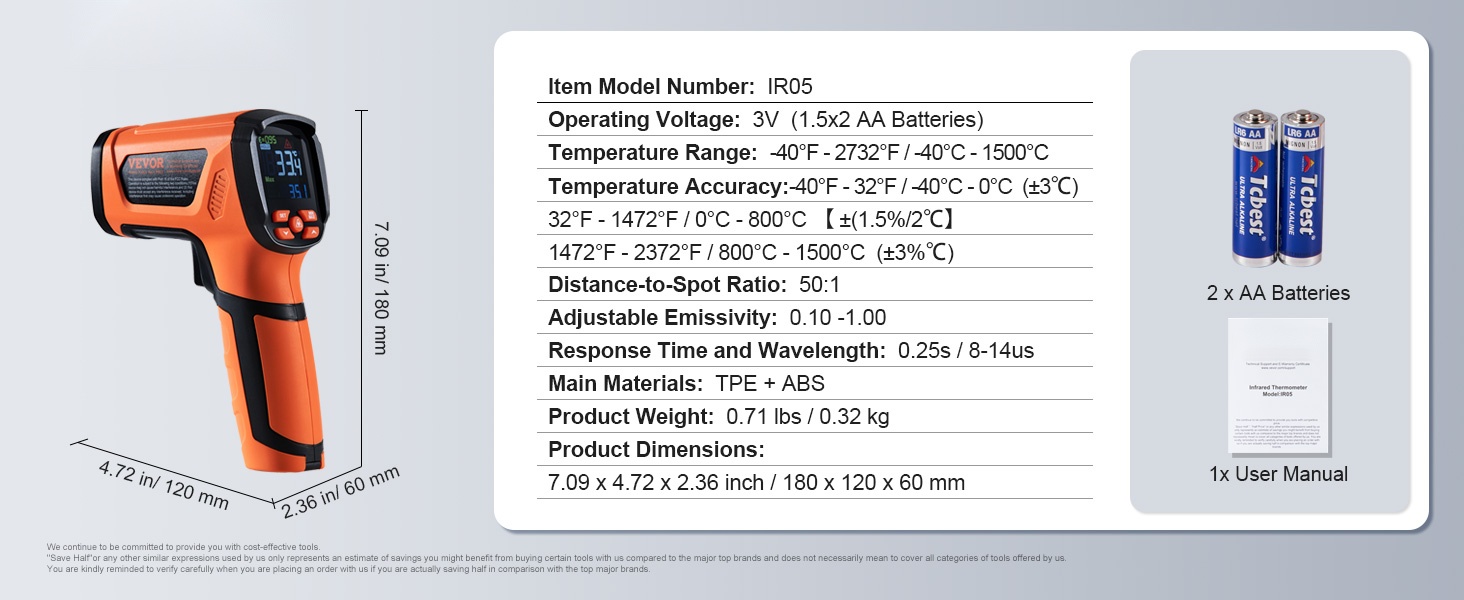 - Lämpötilan tarkkuus: -40°F - 32°F / -40°C - 0°C (±3℃); 32°F - 1472°F / 0°C - 800°C (±1.5% / ±2℃); 1472°F - 2372°F / 800°C - 1500°C (±3%℃)