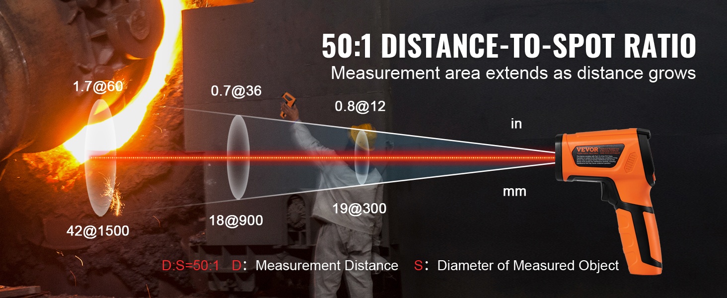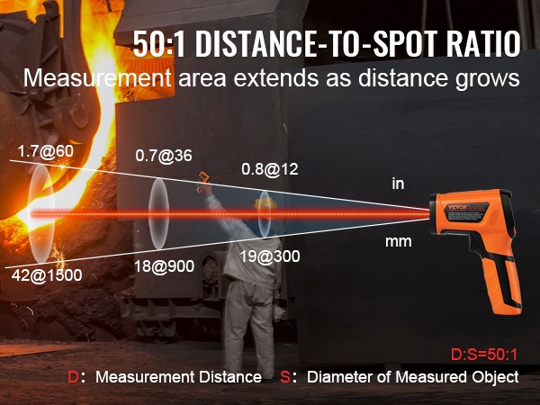 - Etäisyys-piste -suhde: 50:1 turvalliseen mittaukseen etäältä