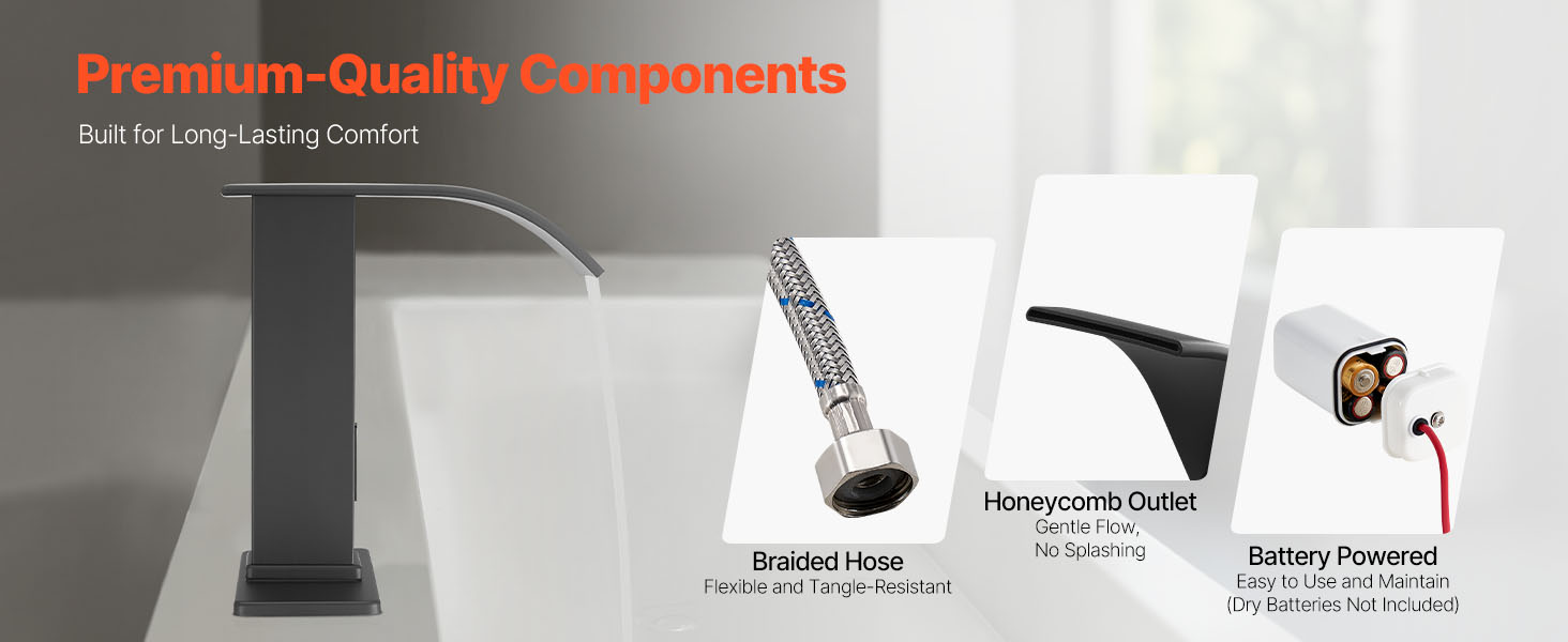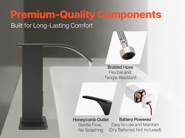 Kestävästä materiaalista valmistettu hana ja taipuisa, taittumista vastaan suunniteltu punottu letku varmistavat tasaisen vedenvirtauksen. Hunajakennoilmastin pehmentää vesisuihkua ja vähentää roiskeita miellyttävämpää käsienpesua varten.