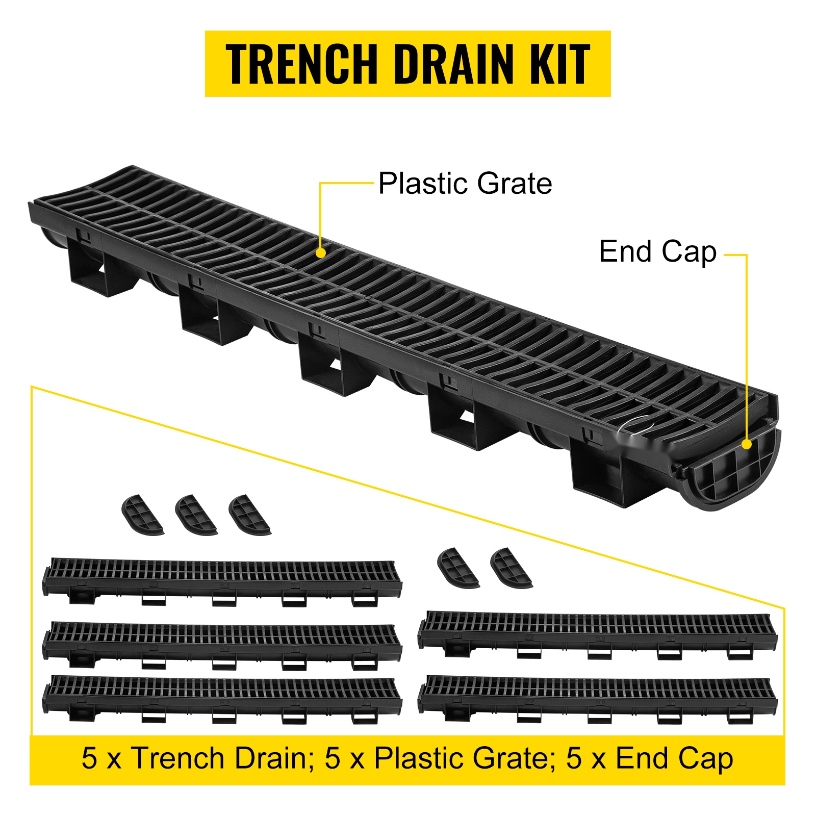 Pakkaus sisältää 5 kouruviemäriosaa, joista jokainen on noin 1 m pitkä. Mukana toimitetaan 5 muoviritilää ja 5 päätykappaletta, joten perusasennukseen tarvittavat osat löytyvät yhdestä paketista.