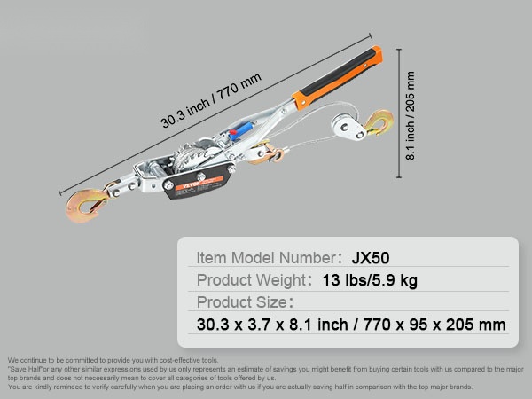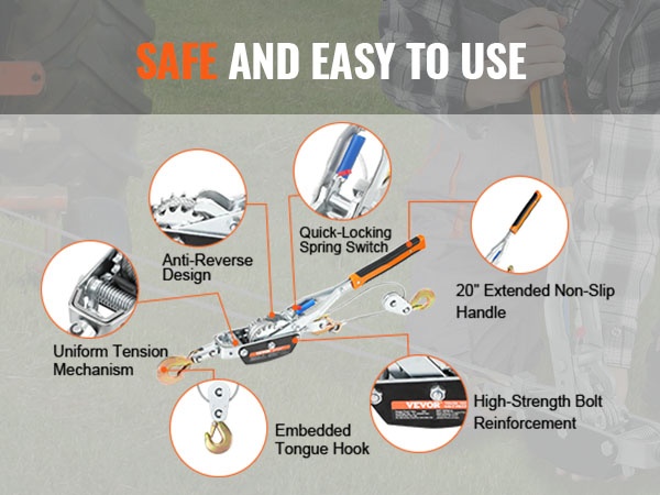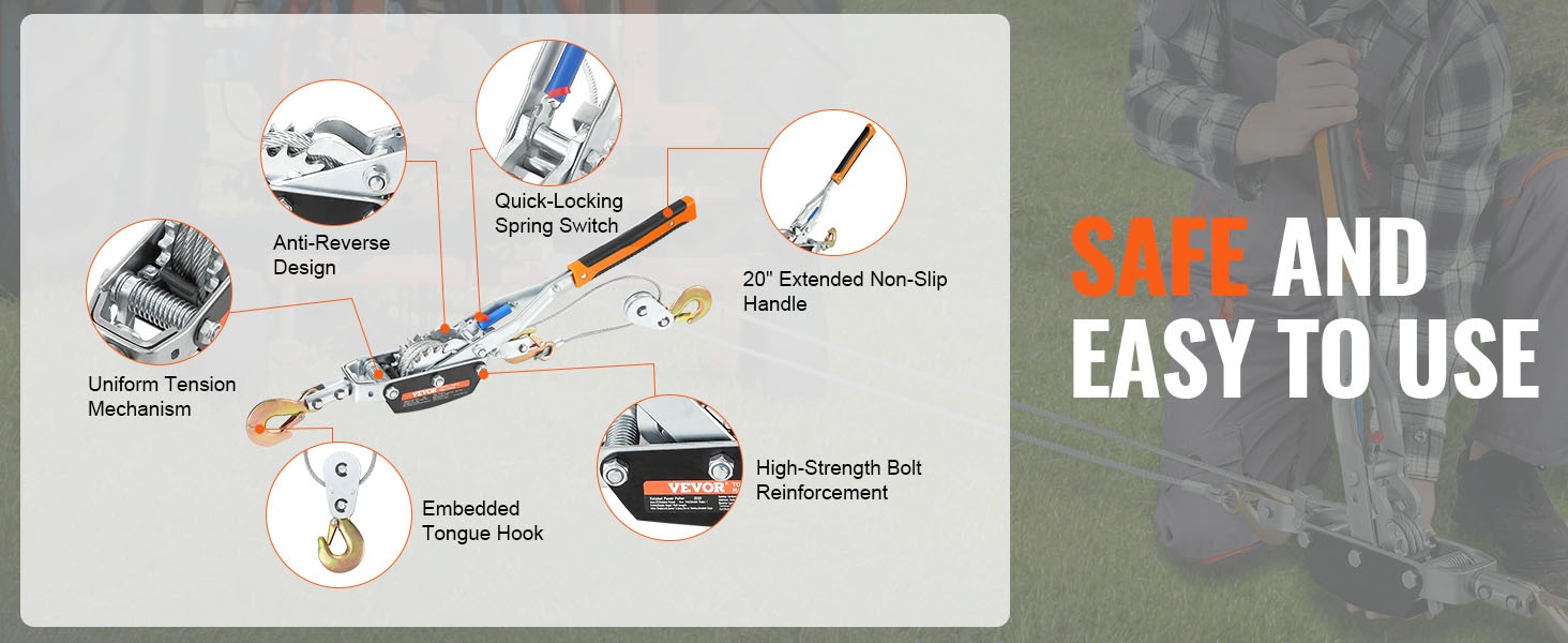 Pitkä, noin 42.9 cm kahva mahdollistaa köyden kiristämisen pienemmällä voimalla. Ergonominen ja liukumaton ote parantaa hallittavuutta, jolloin työskentely on vakaampaa myös raskaampien kuormien kanssa.