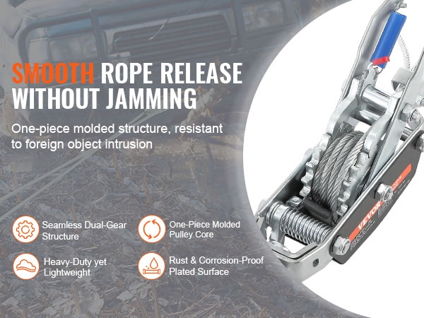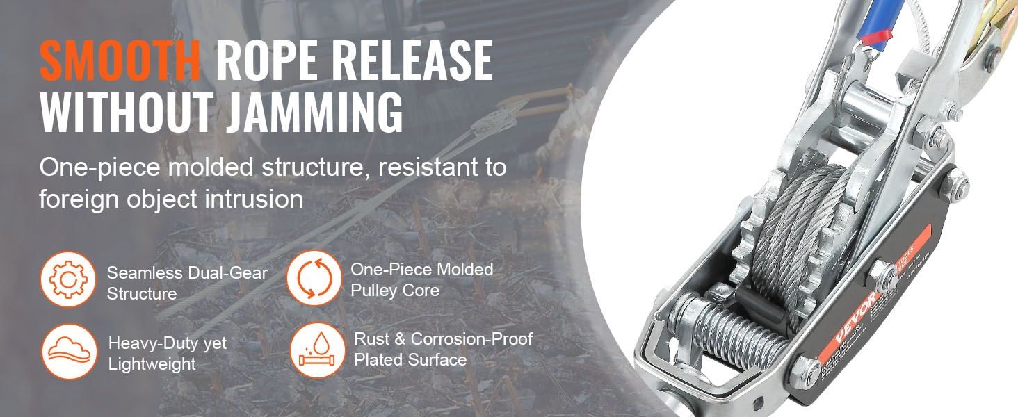 Köysitaljassa on tiukasti punottu, luja polyesteriköysi, joka kestää kulutusta, kosteutta ja vaihtelevia sääolosuhteita. Yksiosainen, valettu alumiininen hammasratasrakenne tekee käytöstä sulavaa ja vähentää perinteisille päällekkäisille rattaineistoille ominaista jumittumista. Kaksoislukituksella ja takaisinpyörimisen estolla varustettu räikkä pitää köyden tukevasti paikallaan myös pidempikestoisissa vetotöissä.