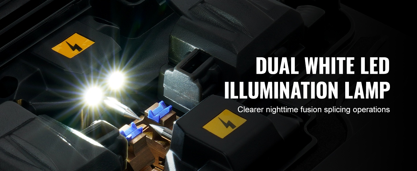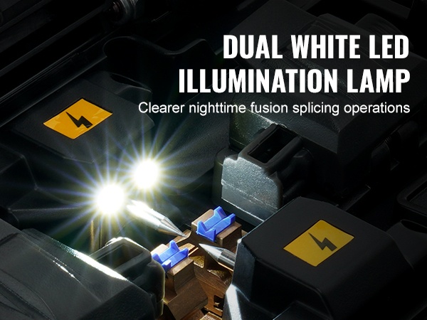 Tuulisuojakannessa on kaksinkertainen LED-valaistus, joka helpottaa kuidun asemointia myös yökäytössä. Tämä varmistaa selkeän näkyvyyden ja tarkan työskentelyn hämärissä tai pimeissä olosuhteissa.