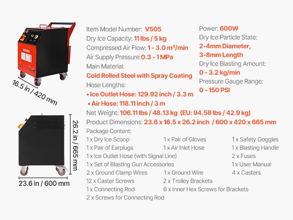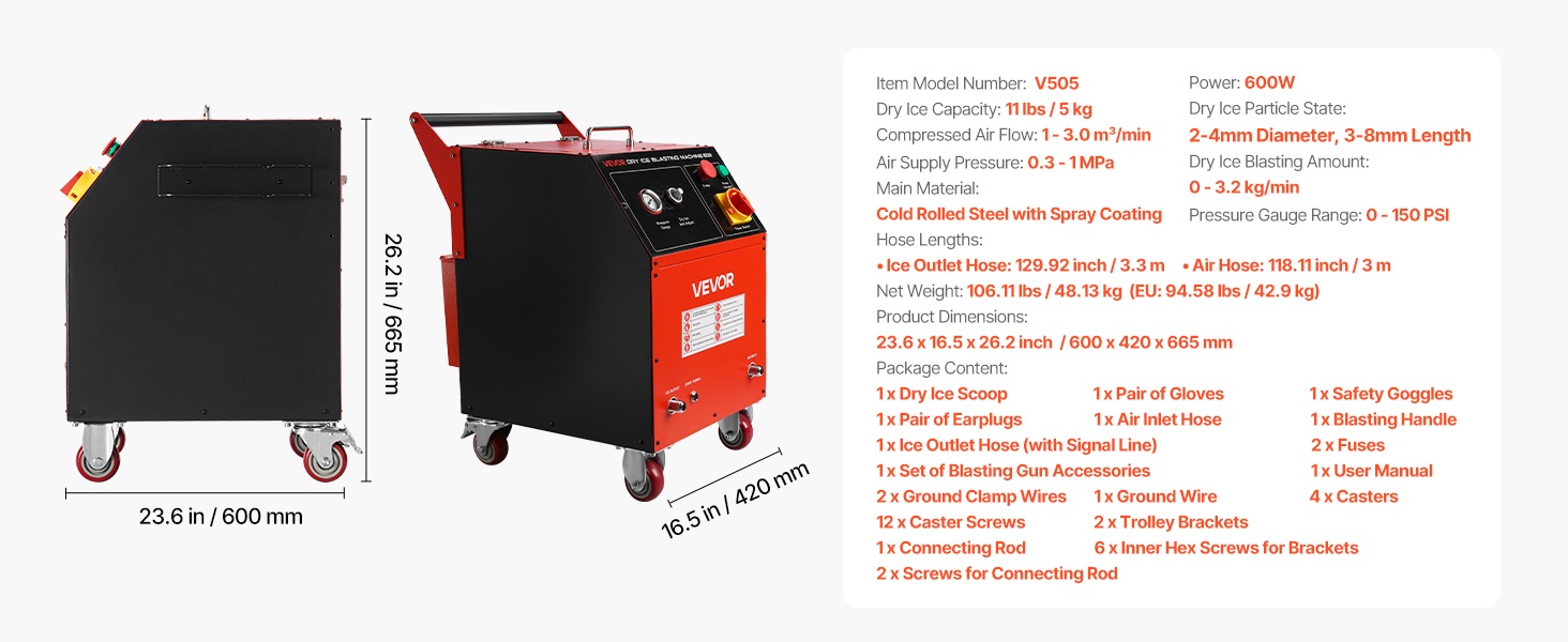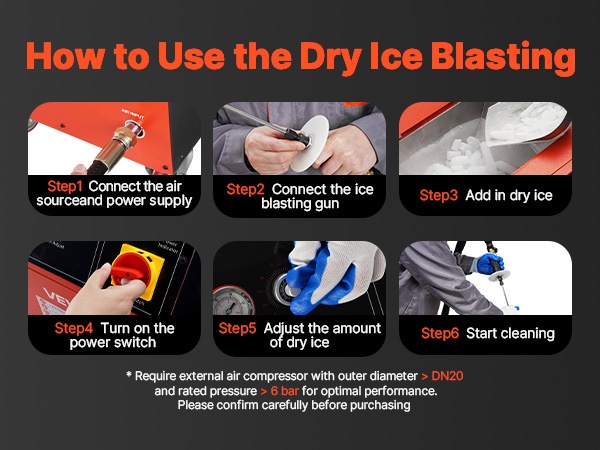 Käyttö edellyttää ulkoista ilmakompressoria, jonka ulkohalkaisija on > DN20 ja nimellispaine > 6 bar. Kuivan jään säiliötilavuus on 11 lbs / 5 kg, ja ilmavirran sekä jään kulutuksen säätöalueet kattavat monenlaiset puhdistustehtävät.