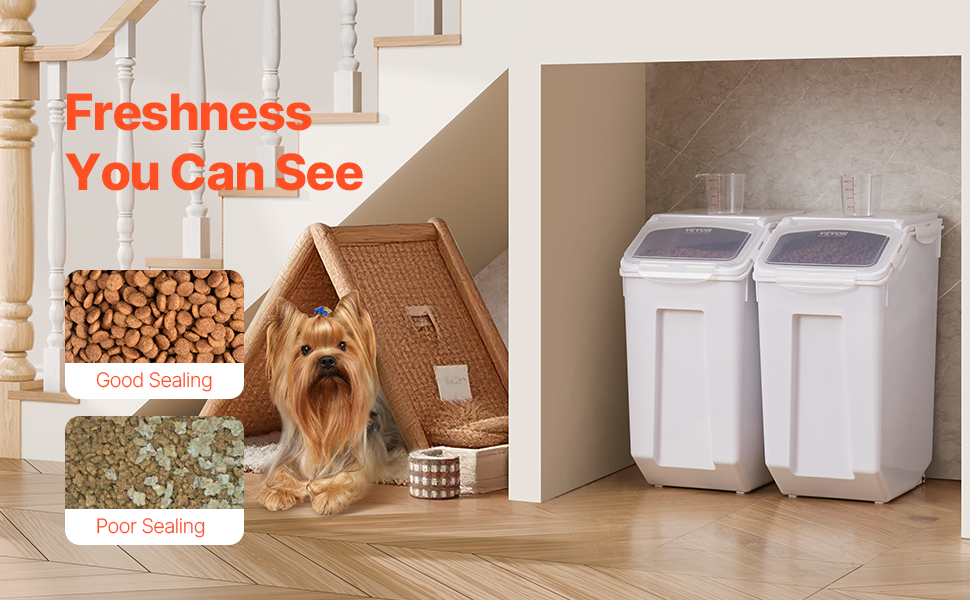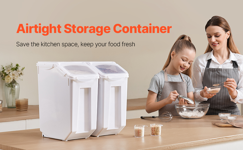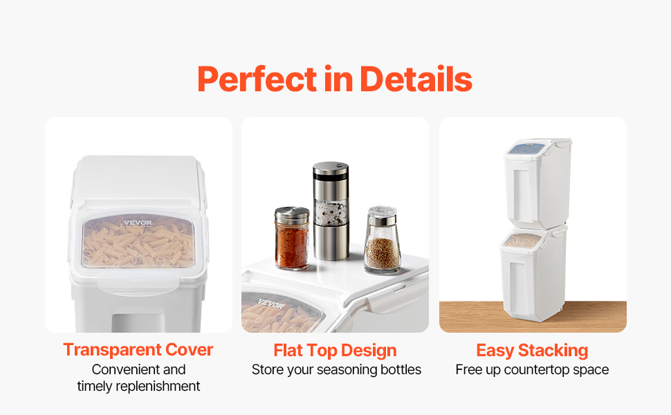 Riisisäiliöön mahtuu jopa 35 lb riisiä tai 17 lb kuivaa lemmikkiruokaa tuotteen tyypistä ja painosta riippuen. Pinottava rakenne auttaa hyödyntämään pystysuuntaista tilaa ja pitämään keittiön tai varastotilan paremmin järjestyksessä.