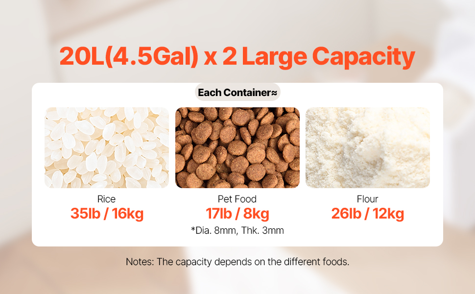 Astia voi pitää jopa ≈16 kg riisiä tai ≈7,7 kg kuivaa lemmikkiruokaa, riippuen täytteen tyypistä.