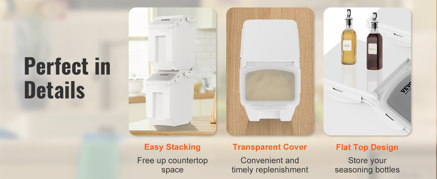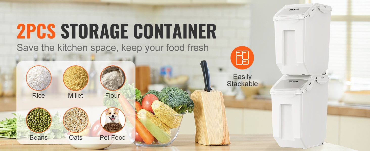 Näiden kahden 15L säilytysastian avulla pidät riisin, jauhot, viljat, pavut, pähkinät tai lemmikkien kuivaruoan järjestyksessä ja suojassa kosteudelta. Ilmatiiviit kannet ja pinottava muoto säästävät tilaa keittiössä tai varastossa.