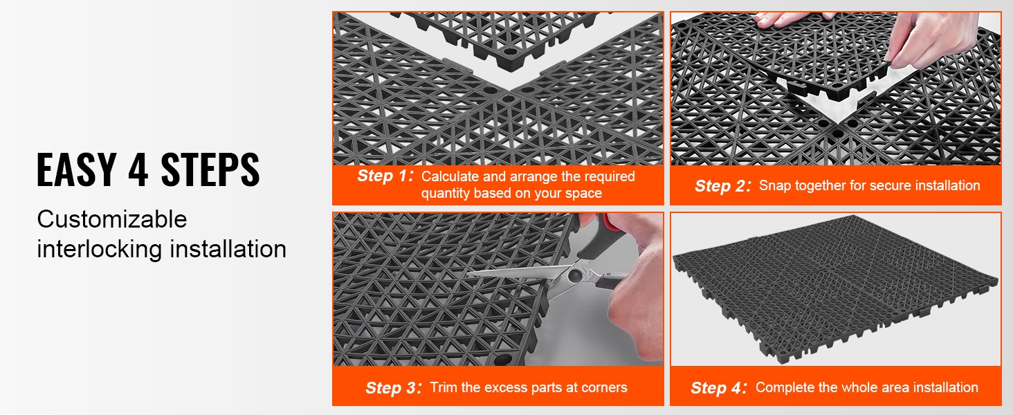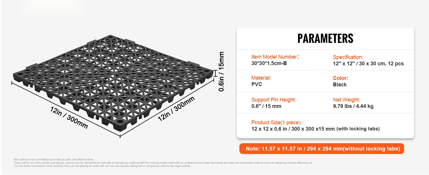 - Tuotteen koko: 12 x 12 x 0.6 tuumaa / 300 x 300 x 15 mm (lukituskielekkeillä)