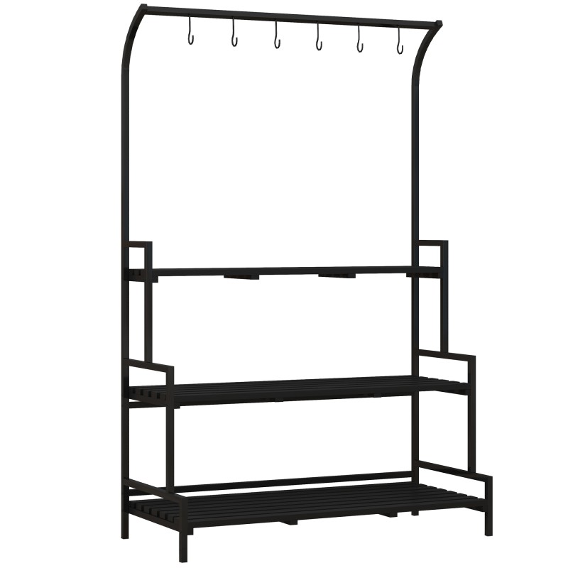 Kukkateline 3 tasoa ja 6 koukkua sisä- ja ulkokäyttöön, puu/teräs, 110 x 50 x 170 cm, musta