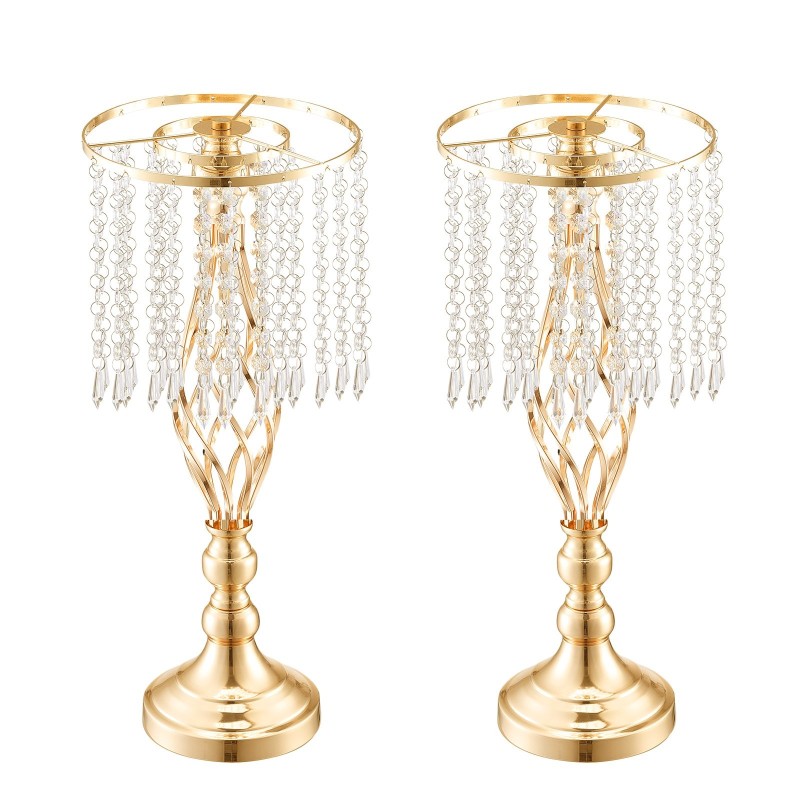 Tyylikäs, 49 cm korkea kristallikoristeinen metallinen kukkateline juhlapöytiin. Ranskan kullanvärinen pinta ja selkeä, ilmava rakenne tekevät siitä näyttävän keskipisteen hääjuhliin, illallisille, syntymäpäiville ja muihin tilaisuuksiin. Hiiliteräksestä valmistettu jalka on tukeva ja viimeistelty, mikä korostaa tilaisuuden juhlallista tunnelmaa.