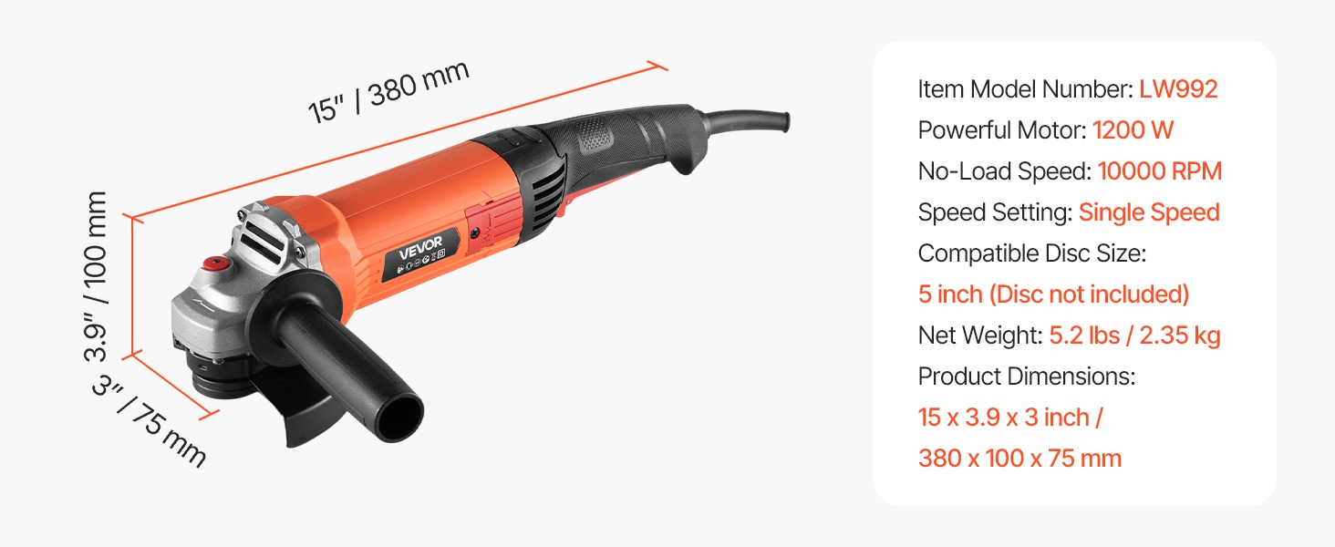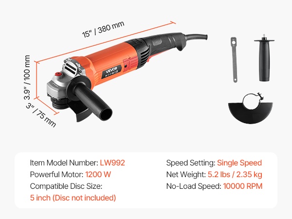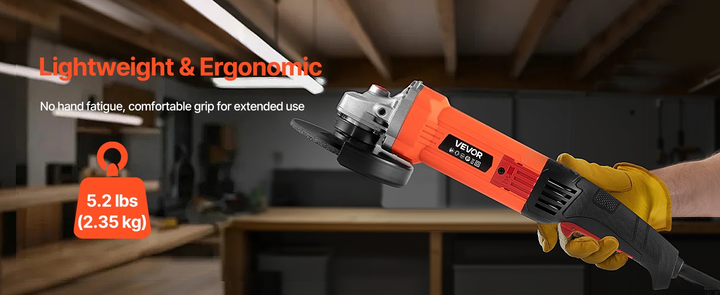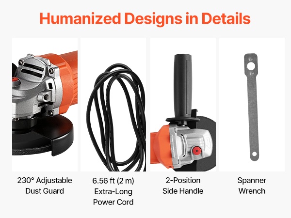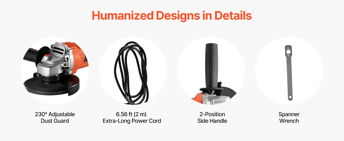 270° säädettävä pölysuoja auttaa ohjaamaan kipinöitä ja pölyä poispäin käyttäjästä. 2-asentoinen sivukahva voidaan kiinnittää kumpaan tahansa puoleen, mikä mahdollistaa paremman hallinnan oikea- ja vasenkätisille käyttäjille. 6.56 ft (2 m) virtajohto antaa riittävästi liikkumavaraa työtilassa.
