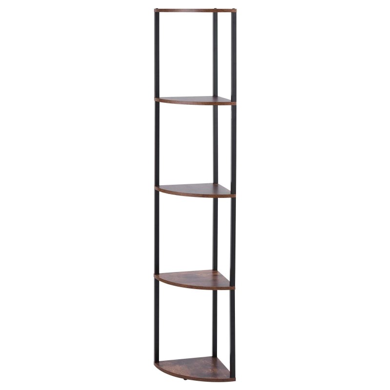 Korkea 5-tasoinen kulmahylly, jossa on metallirunko ja puuhyllyt, auttaa hyödyntämään nurkkatilan tehokkaasti makuuhuoneessa, olohuoneessa tai toimistossa. Kapea hyllytorni sopii esimerkiksi kirjoille, koriste-esineille ja kasveille, ja integroitu LED-valonauha luo tunnelmallisen valaistuksen.