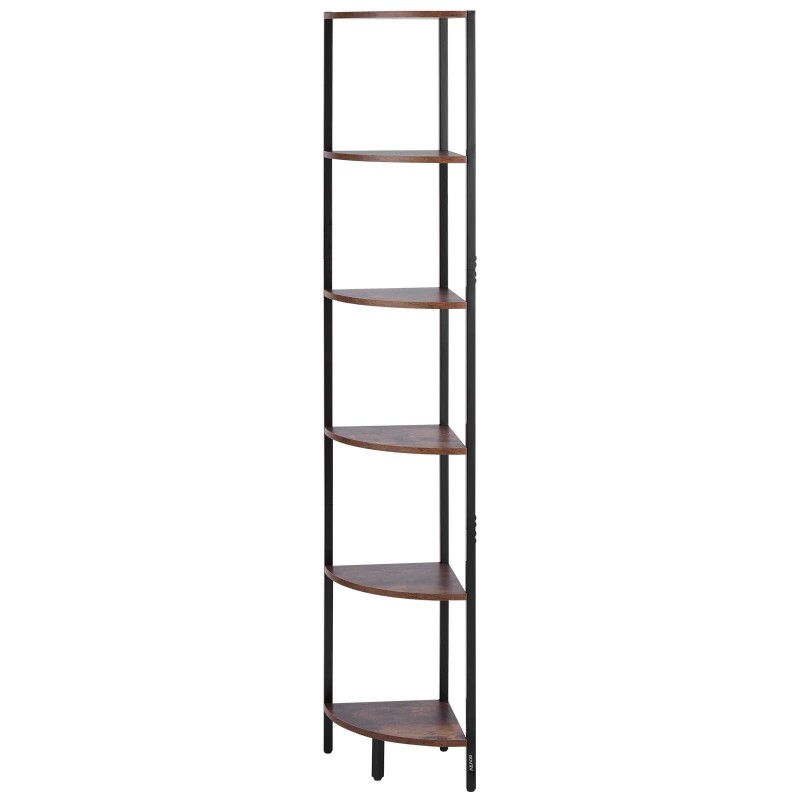 Korkea 6-tasoinen kulmahylly, jossa on metallirunko ja puuhyllyt, sopii kapeisiin kulmiin makuuhuoneessa, olohuoneessa tai toimistossa. Integroitu LED-valonauha tuo lisäilmettä esillepanoon ja helpottaa kirjojen, koriste-esineiden ja arjen tavaroiden järjestämistä.