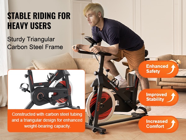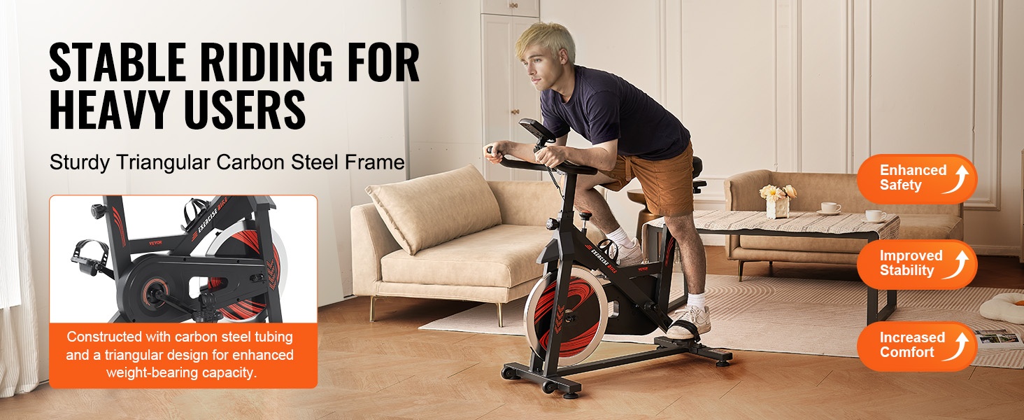 Kuntopyörän runko on valmistettu hiiliteräksestä, ja leveä putkirakenne sekä tarkka hitsaus takaavat korkean jäykkyyden ja kestävyyden. Kolmiomainen rakenne tukee suuria painoja ja lisää turvallisuutta sekä vakautta harjoittelun aikana.