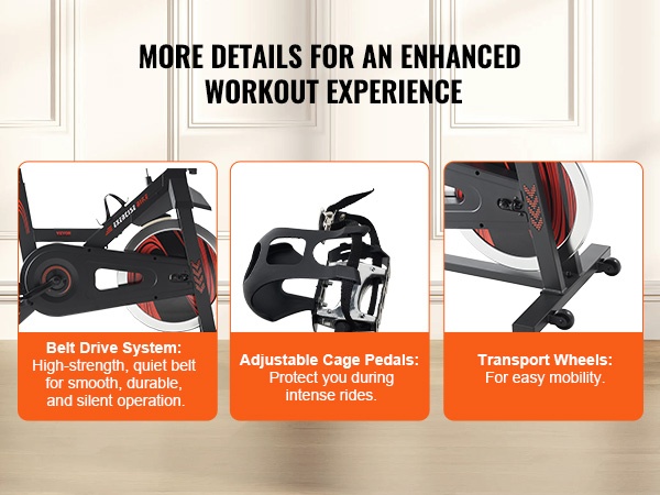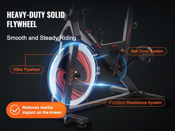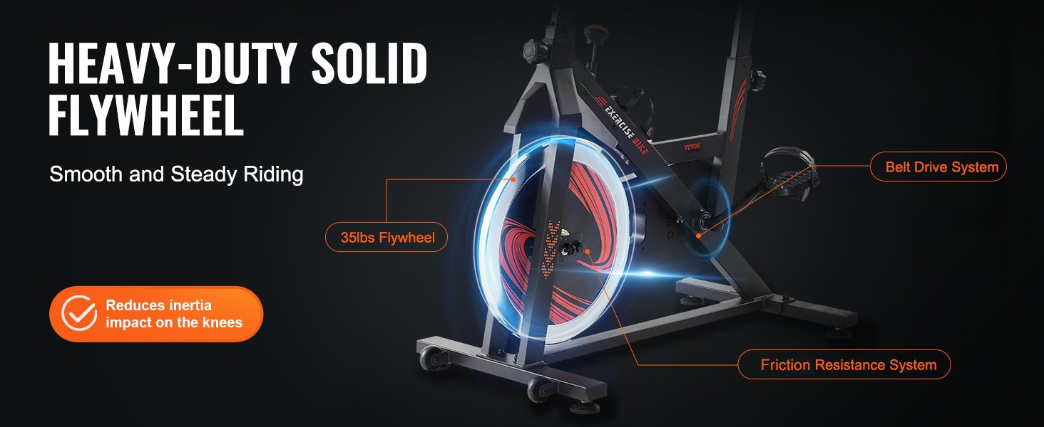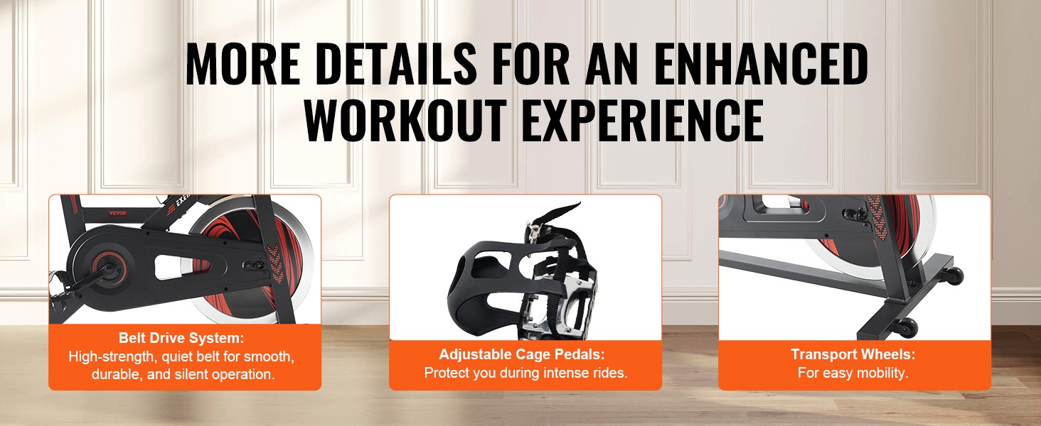 Hiljainen, korkealujuuksinen hihnavetojärjestelmä mahdollistaa tasaisen ja pitkäikäisen käytön. Säädettävät, häkkityyppiset alumiinipolkimet pitävät jalat tukevasti paikoillaan myös kovemmassa vauhdissa. Vastussäätimen painalluksella vauhtipyörän saa pysäytettyä nopeasti. Integroituja kuljetuspyöriä hyödyntämällä laitetta on helppo liikutella huoneesta toiseen.