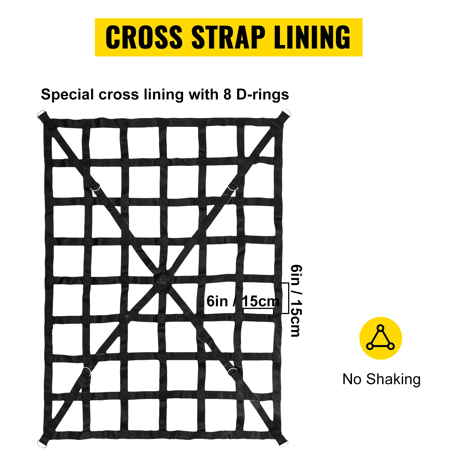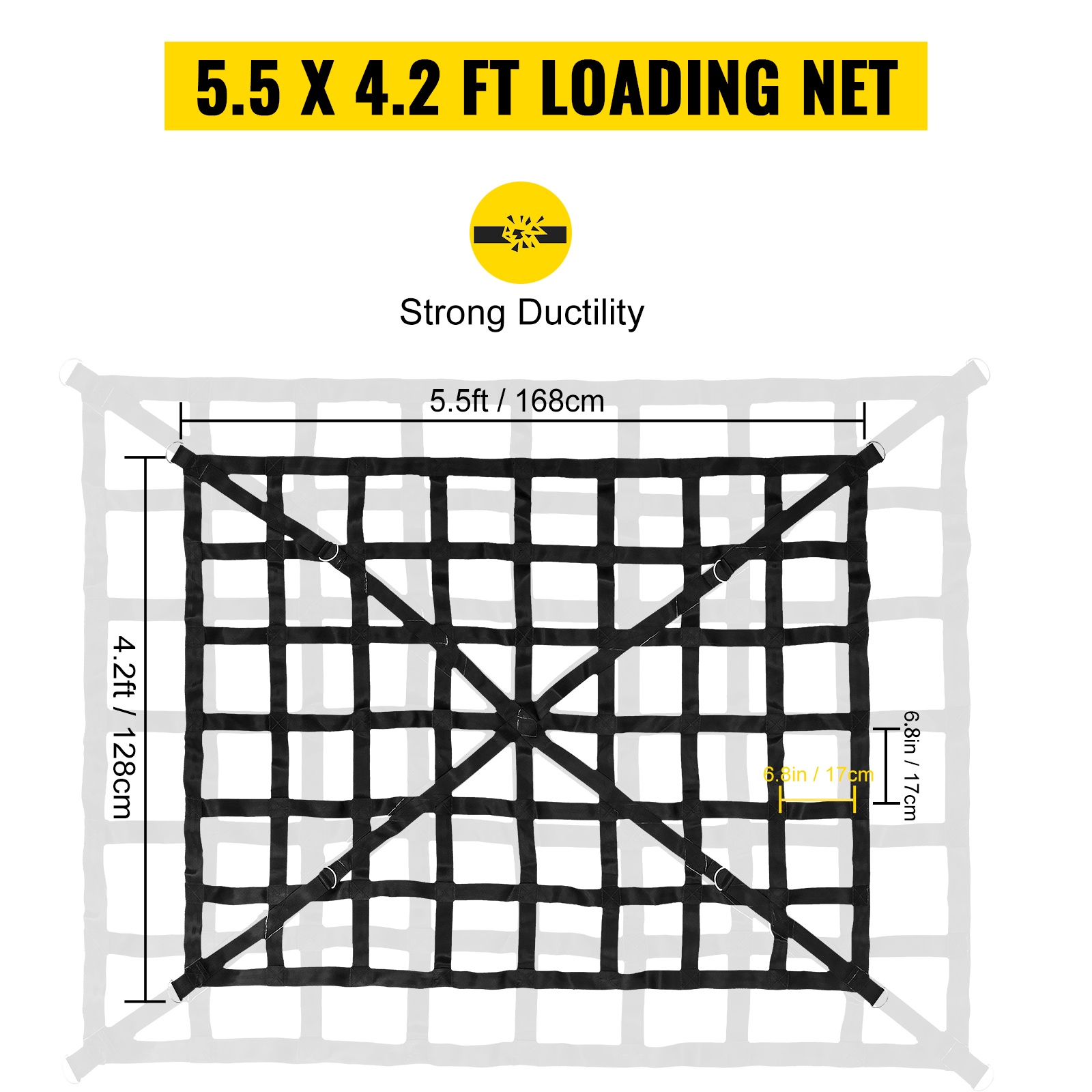 Verkon koko on 168×128 cm, ja ruutukoko 6×6 tuumaa / 15×15 cm. Mukana tulevat koukkuremmit helpottavat verkon kiinnittämistä useista pisteistä, jolloin kuorma saadaan tuettua tasaisesti ja turvallisesti.