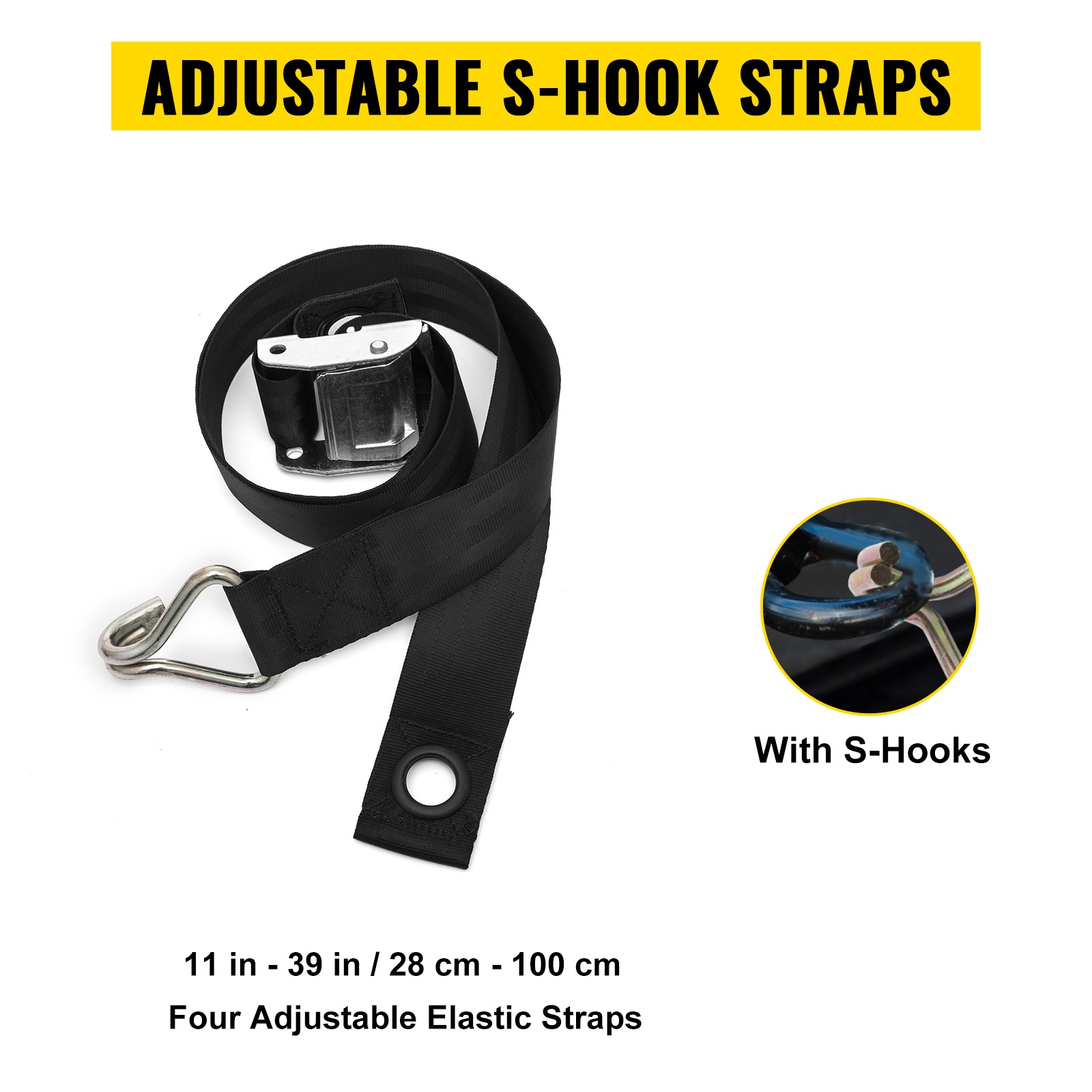 Mukana tulevien 4 S-koukkuhihnan pituus on säädettävissä välillä 28–100 cm (11–39 in). Näin verkko voidaan kiinnittää useisiin eri sidontapisteisiin ja erikokoisiin kuormiin.