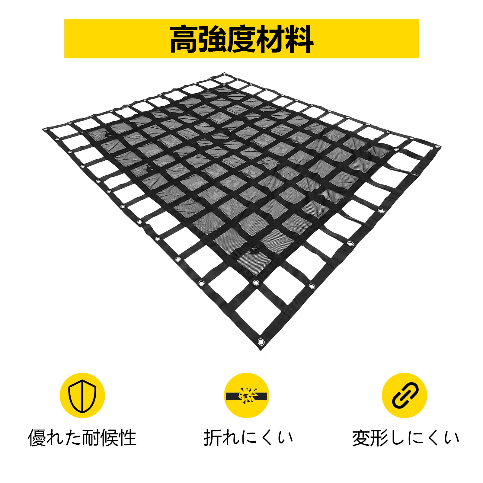 Kuormaverkko on valmistettu teollisuusluokan polyesteristä, ja kiinnityksessä käytettävät rautaosat on sinkitty. Rakenne on suunniteltu pitkäaikaiseen ja toistuvaan käyttöön.