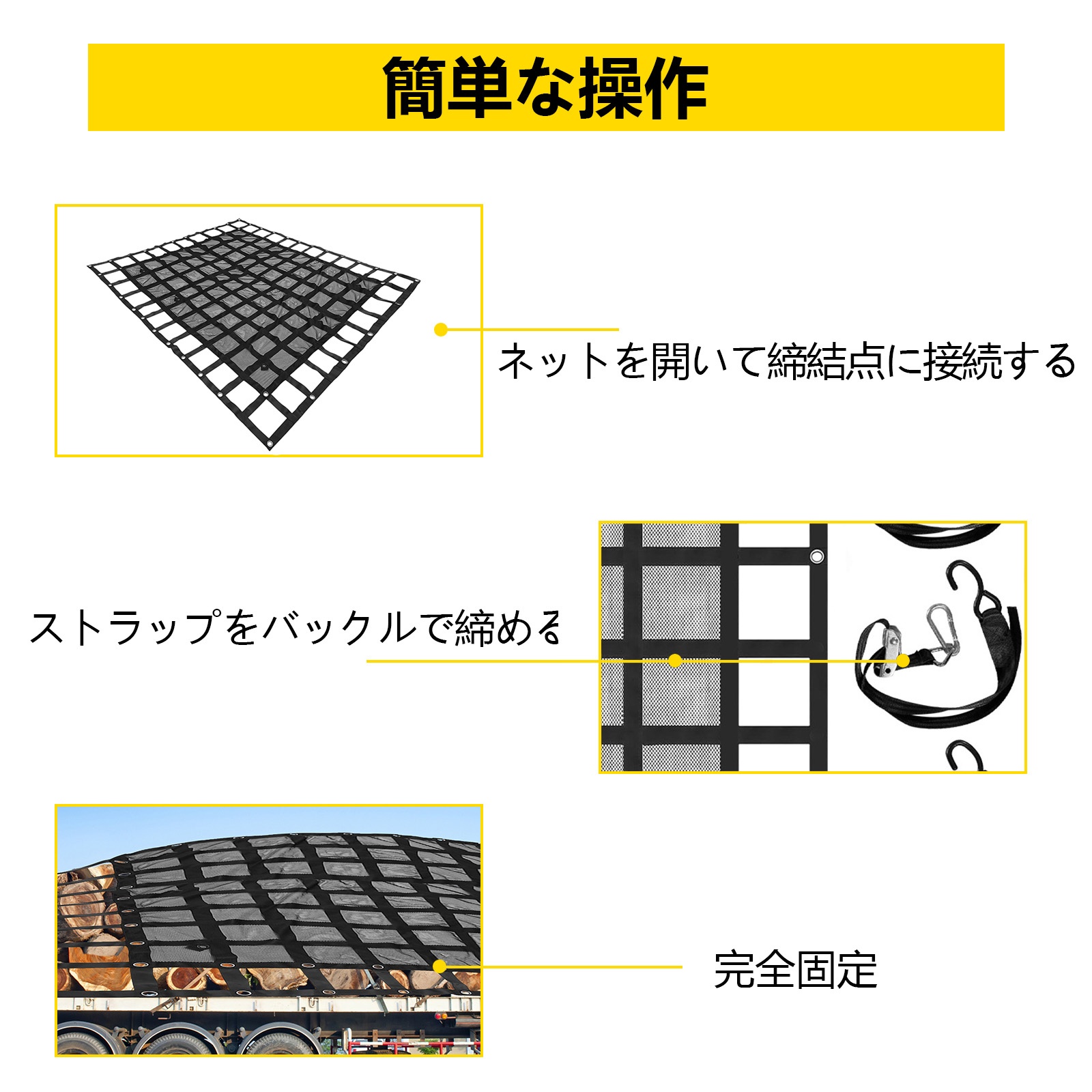 Verkko kiinnitetään ajoneuvon sidontapisteisiin S-koukuilla, ja hihnat kiristetään kamsoljilla. Näin kuorma saadaan nopeasti ja vaivattomasti tukevasti paikoilleen.