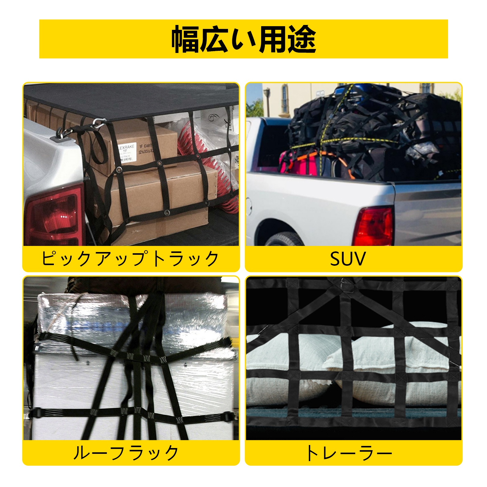 Raskaan käytön kuormaverkkoa voidaan käyttää lava-auton kuormatilassa, perävaunussa tai esimerkiksi varaston tai autotallin kattoritilänä tavaroiden säilyttämiseen. Kantavuutta ei tule ylittää: enintään 500 kg/1100 lbs.