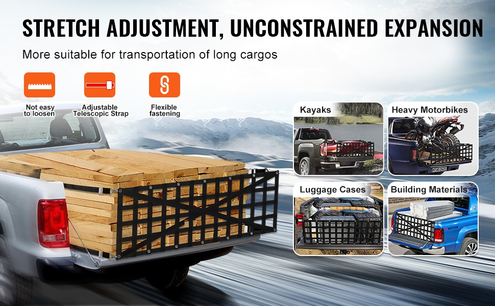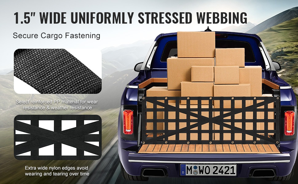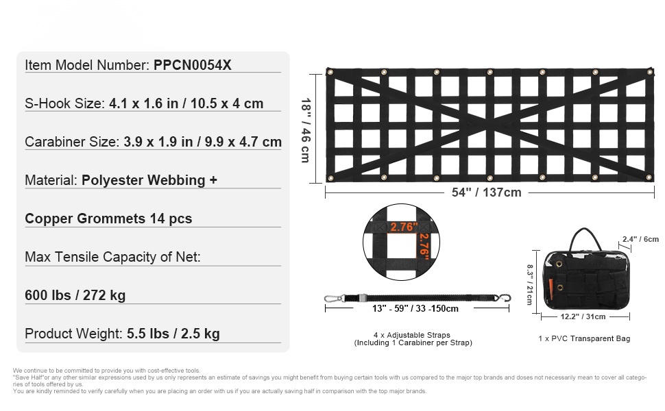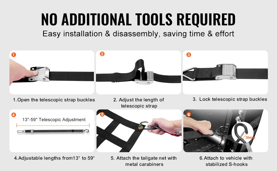 - Portaattomasti säädettävät hihnat (pituus 13–59 in / 330–1500 mm) eri kokoisille kuormille.