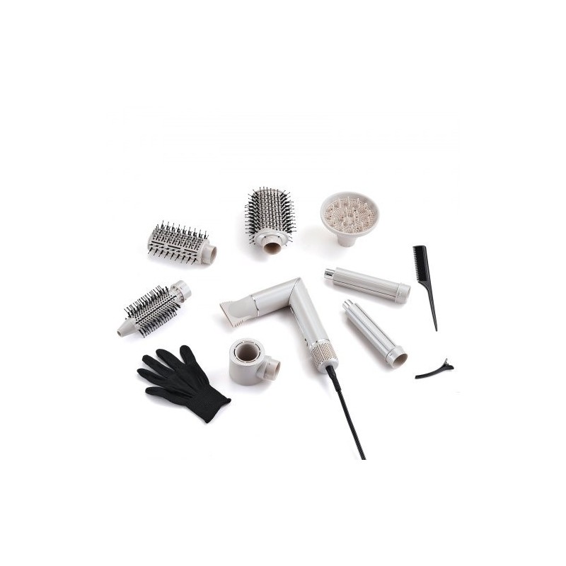 Monitoiminen 7-in-1 kuumailmamuotoilija yhdistää hiustenkuivaimen ja useita harjapäitä yhteen laitteeseen. Voit kuivata, muotoilla, silottaa, tuuheuttaa ja kihartaa hiukset samalla laitteella, mikä säästää tilaa ja helpottaa arkea.