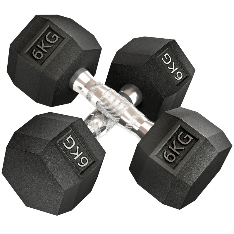 Kuusikulmaiset käsipainot 2 x 6 kg, kumipäällysteinen valurauta, musta, 2 kpl setti koti- ja kuntosaliharjoitteluun