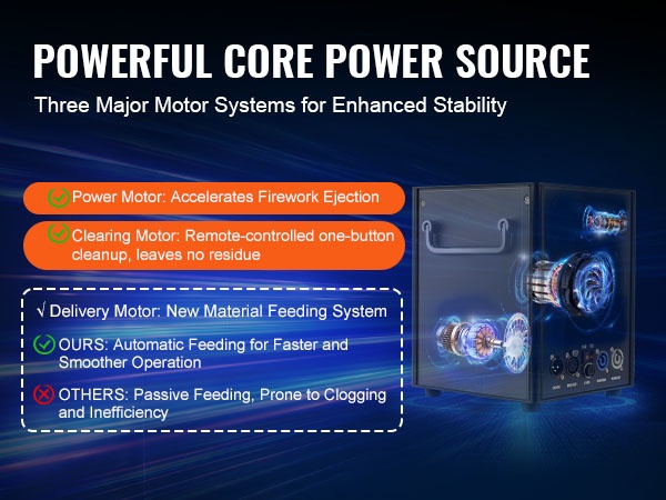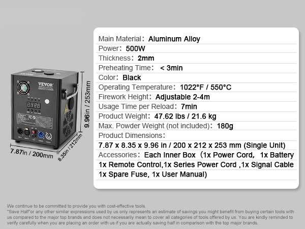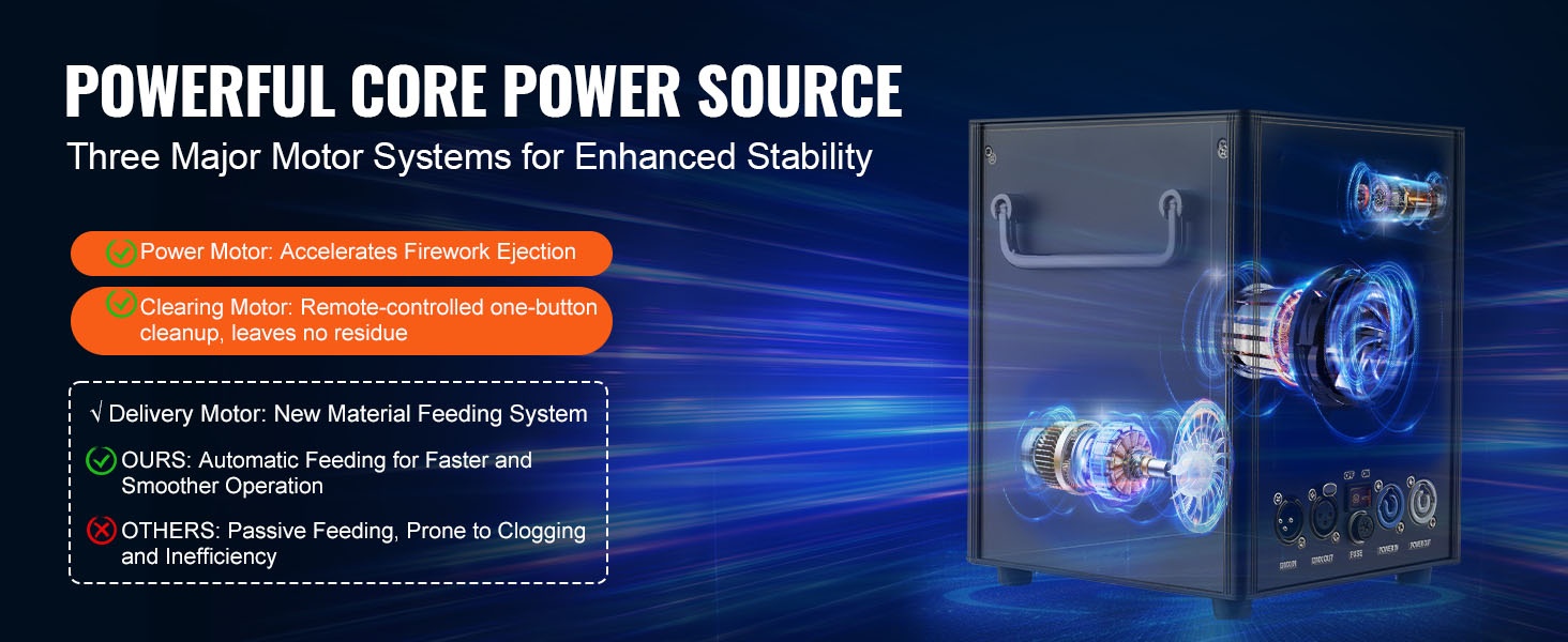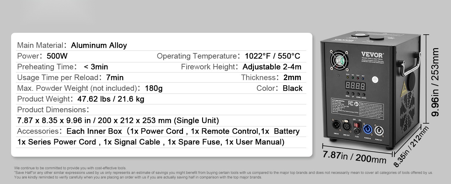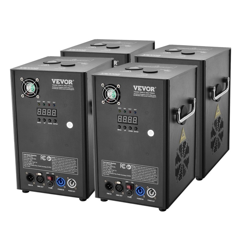 Kylmäkipinäkonesarja (4 kpl), joka tuottaa näyttäviä, mutta viileitä kipinäsuihkuja juhliin, häätilaisuuksiin, klubeille ja lavakäyttöön. Koneet on valmistettu kestävästä alumiiniseoksesta, niitä ohjataan langattomalla kaukosäätimellä tai DMX-järjestelmällä, ja kipinäkorkeus on säädettävissä välillä 2–5 m.