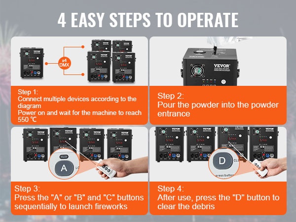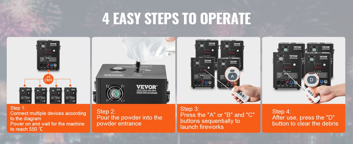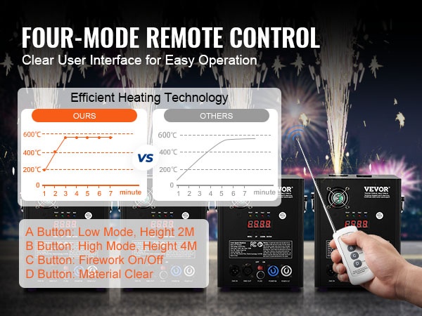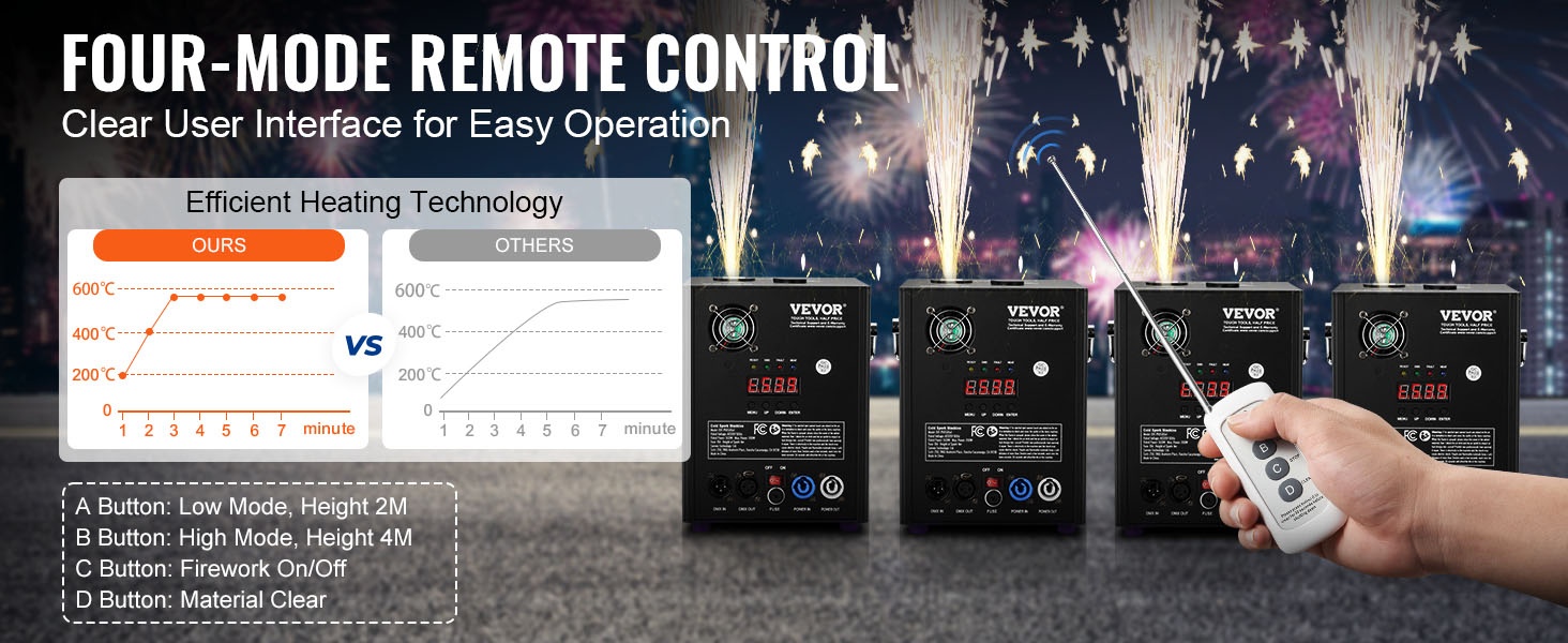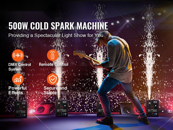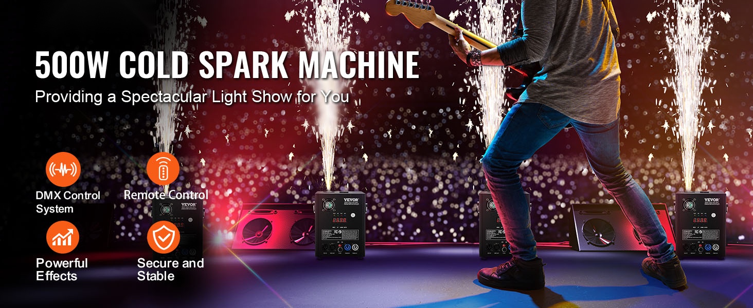 Koneet luovat tasaisen ja kirkkaan kipinäsuihkun, jota voi hallita DMX:n tai langattoman kaukosäätimen avulla. Selkeä LED-näyttö ja yksinkertainen käyttöliittymä helpottavat asetusten säätöä myös hämärässä ympäristössä.