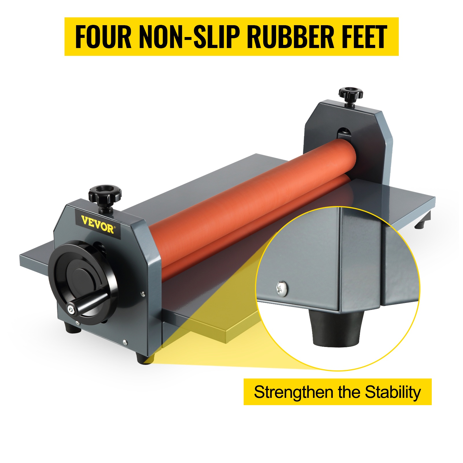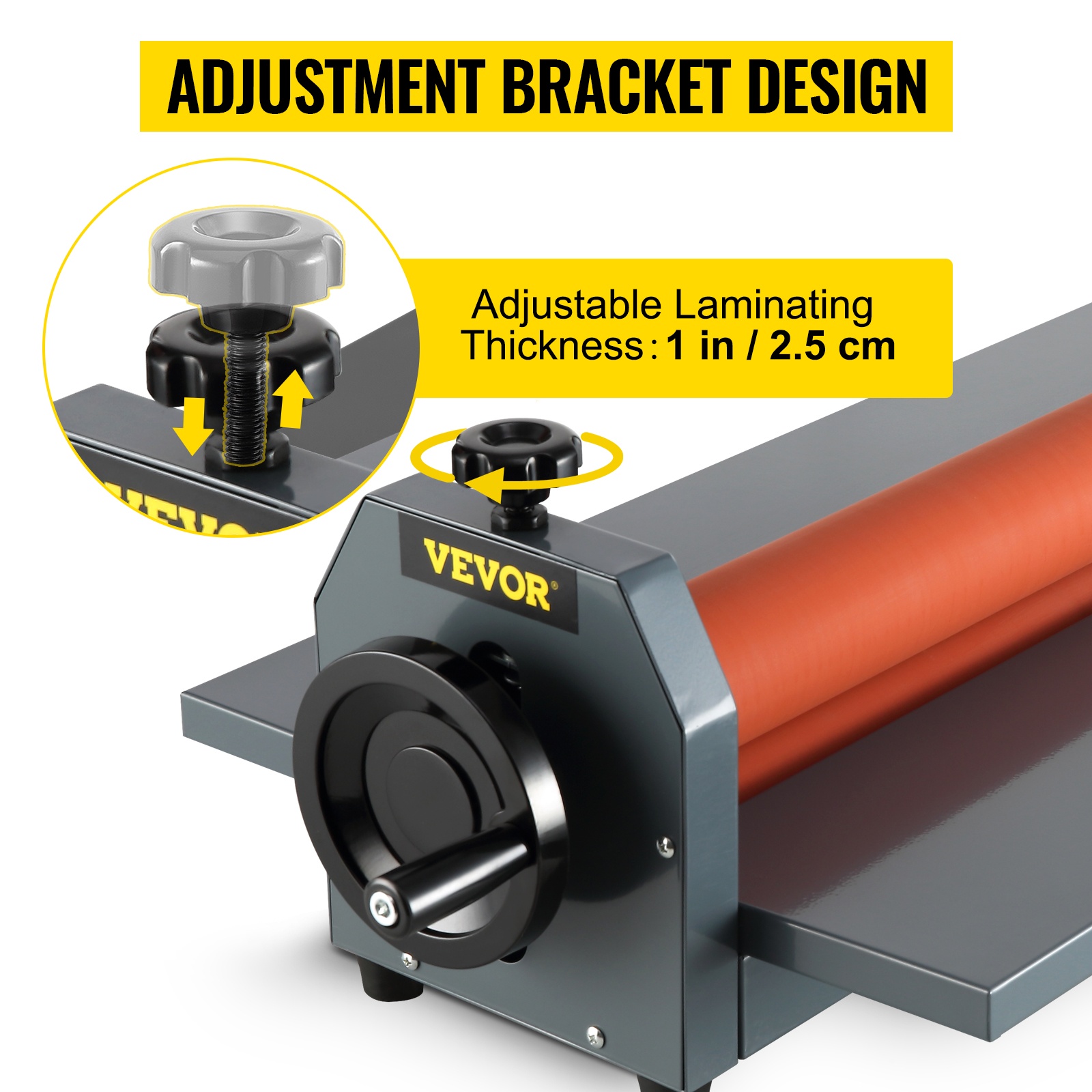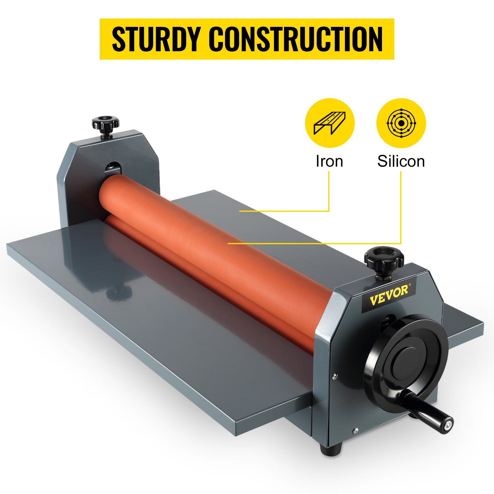 Työtä helpottava käsipyörä mahdollistaa nopean laminoinnin – pyöritä vain käsipyörää ja materiaali kulkee telojen läpi. Sähköä ei tarvita, joten laitetta voi käyttää lähes missä tahansa.