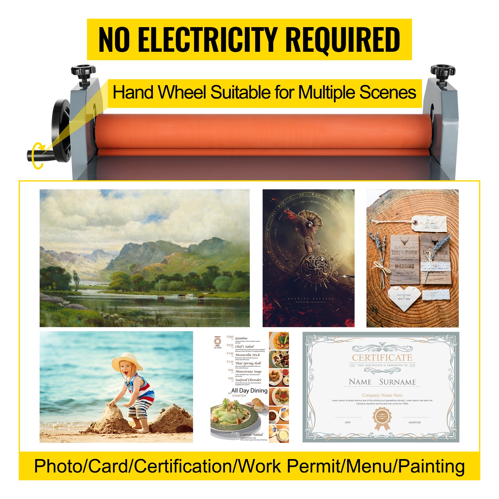 Laite toimii täysin manuaalisesti ja sen voi pysäyttää tai avata koska tahansa työn aikana. Käsipyörä sopii esimerkiksi valokuvien, korttien, todistusten, kulkulupien, valikkolistojen ja piirrosten laminointiin.