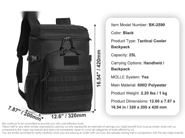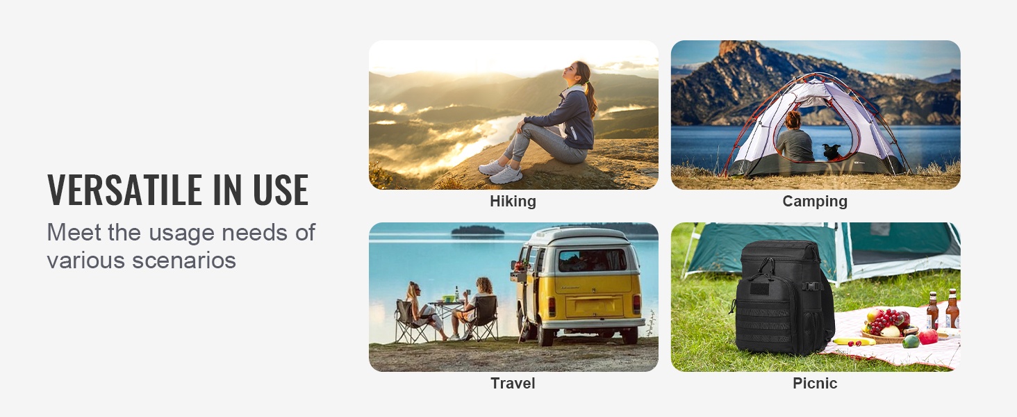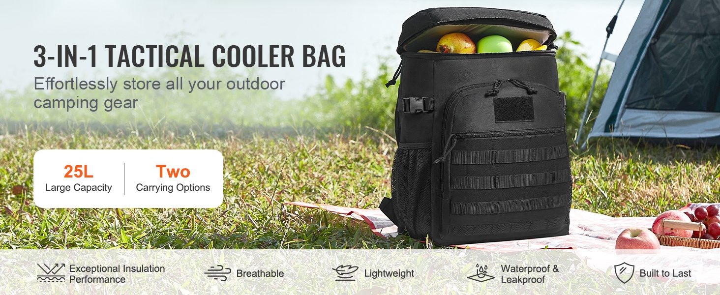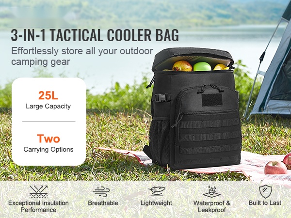 Tämä 25L kylmälaukku pitää ruoat ja juomat viileinä ja helposti mukana arjessa ja retkillä. Laukkua voi kantaa kädessä, olalla tai reppuna, ja monipuoliset taskut sekä MOLLE-kiinnitysjärjestelmä auttavat pitämään tavarat järjestyksessä.