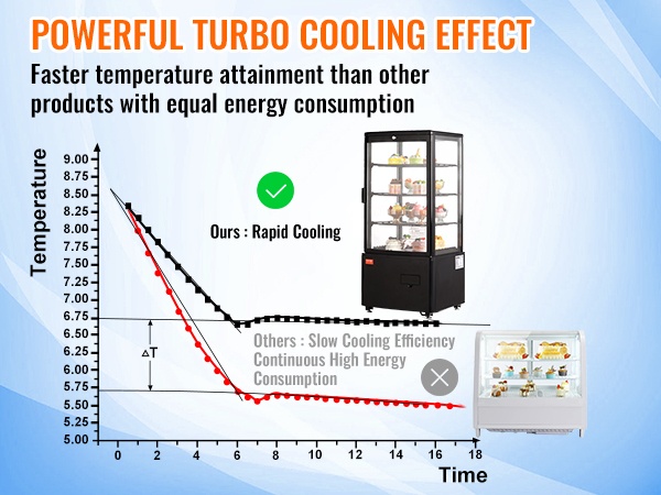 Turbojäähdytys viilentää sisätilan nopeasti miellyttävään 35.6℉–42.8℉ / 2℃–6℃ lämpötila-alueeseen. No-frost-ilmankierto huolehtii tasaisesta kylmyydestä koko kaapissa ja vähentää manuaalisen sulatuksen tarvetta.