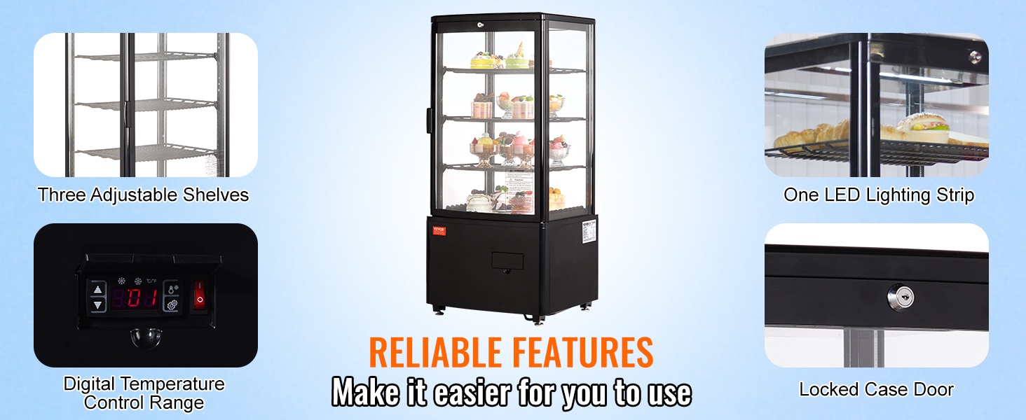 Säädettävät hyllyt helpottavat erikokoisten tuotteiden asettelua. LED-valaistus tuo esillepanoon valoa ja tekee tuotteista helposti nähtäviä eri valaistusolosuhteissa. Digitaalinen lämpötilanäyttö helpottaa kaapin lämpötilan seuraamista ja säätöä.