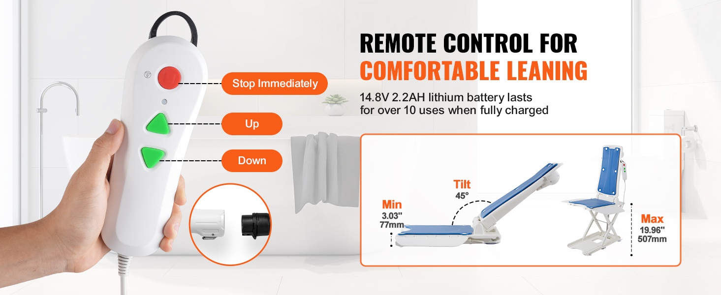 - Istumakorkeuden säätö 3.03–19.96 inch / 77–507 mm helpottaa siirtymistä kylpyammeeseen ja siitä pois.