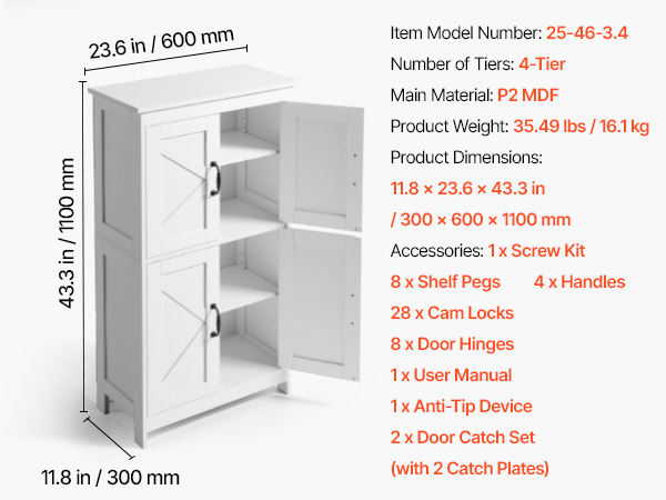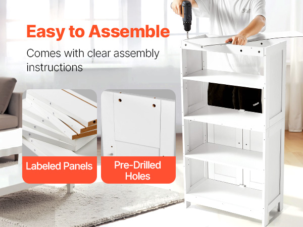 Vapaasti lattialla seisova kaappi toimitetaan tarvittavien tarvikkeiden ja esiporattujen reikien kanssa. Jokainen osa on numeroitu, mikä helpottaa kokoamista vaihe vaiheelta.