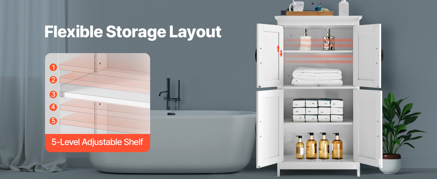 Valmiit hyllynkannatinreiät mahdollistavat hyllyn korkeuden säätämisen 5 tasolle. Näin kaappi mukautuu erikokoisille tavaroille, kuten saippuakipoille, ihonhoitotuotteille, pyykkiaineille ja pyyhekoreille, ja sisätila on helpompi järjestää omien tarpeiden mukaan.