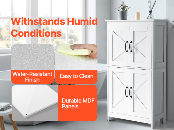 Kaappi on valmistettu laadukkaasta P2 MDF-levystä, jonka pinnassa on vesitiivis pinnoite. MDF:n tasainen tiheys ja tiivis sisäinen rakenne tekevät siitä jäykemmän ja vakaamman kuin tavallinen puu tai muovi, mikä lisää kestävyyttä ja vähentää vääntymisen tai halkeilun riskiä kosteissa tiloissa.