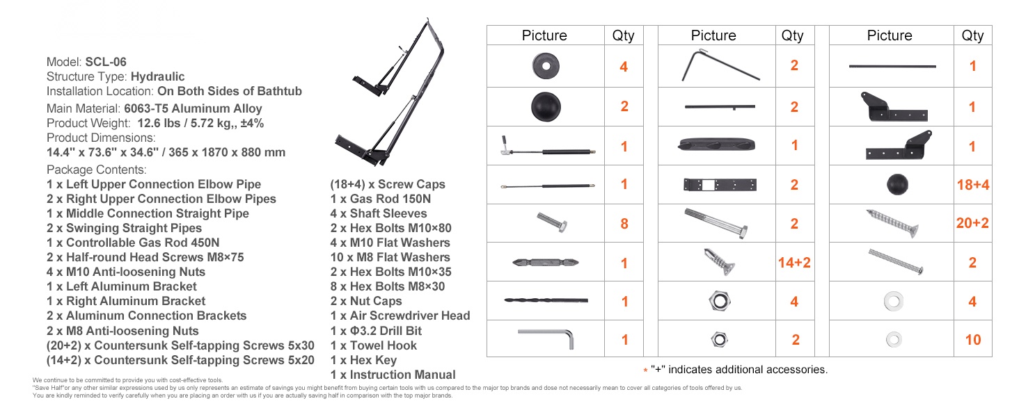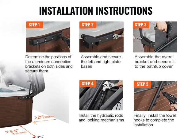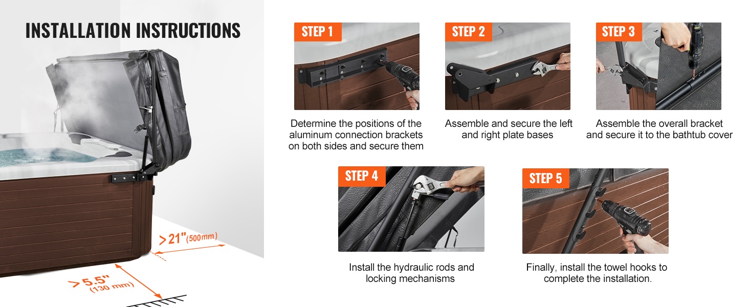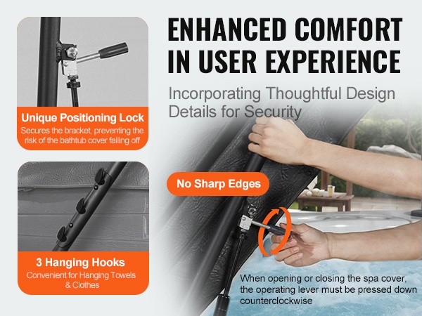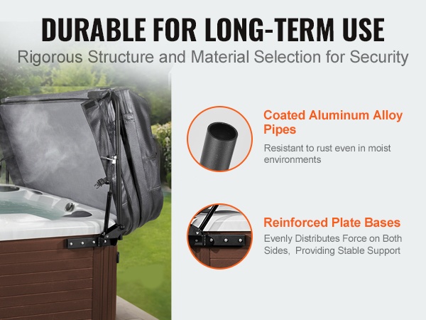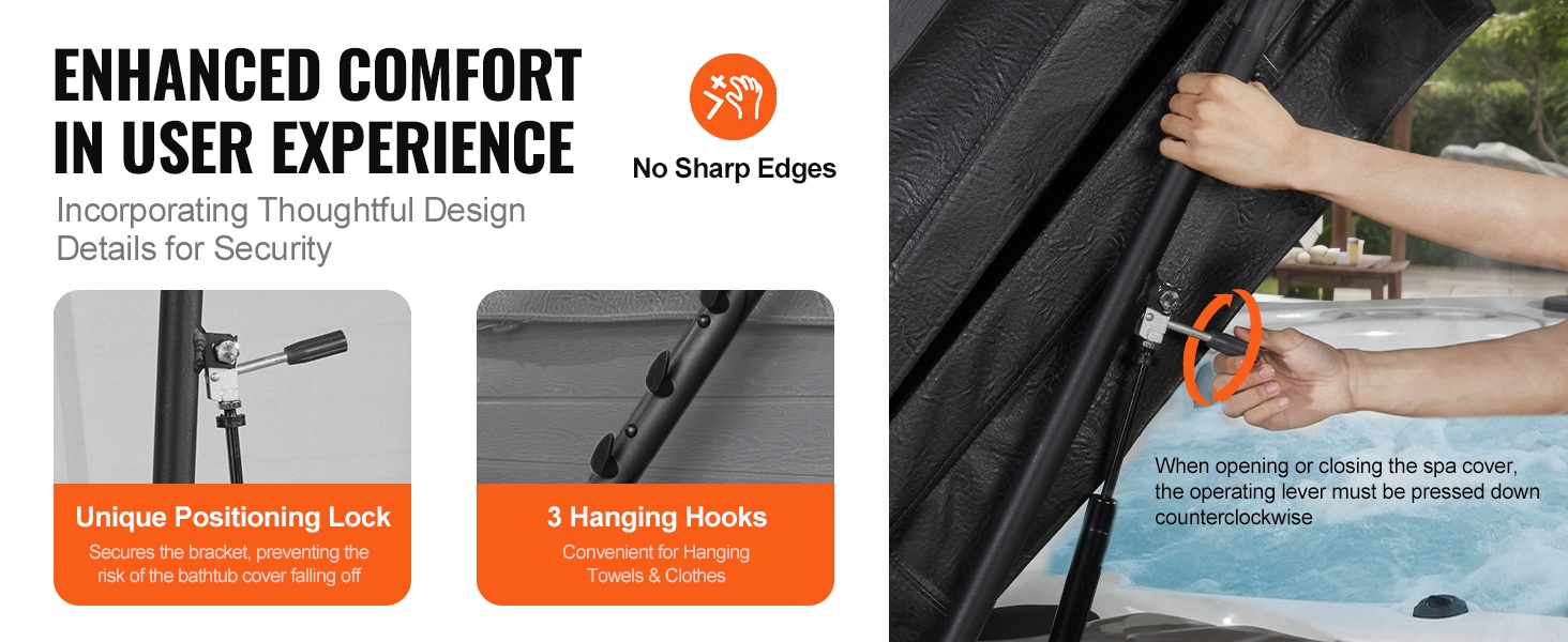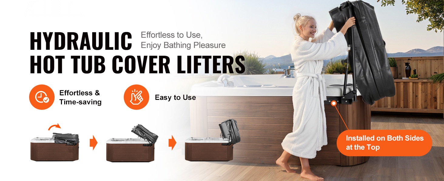 Hydraulinen kannennostin tekee kylpytynnyrin kannen avaamisesta ja sulkemisesta yksinkertaista ja turvallista. Säädettävä 175–245 cm, tukeva 6063‑T5 alumiini, turvalukko, pyyheteline. Helppo asennus, kestävät kiinnityslevyt varmistaavat vakauden.