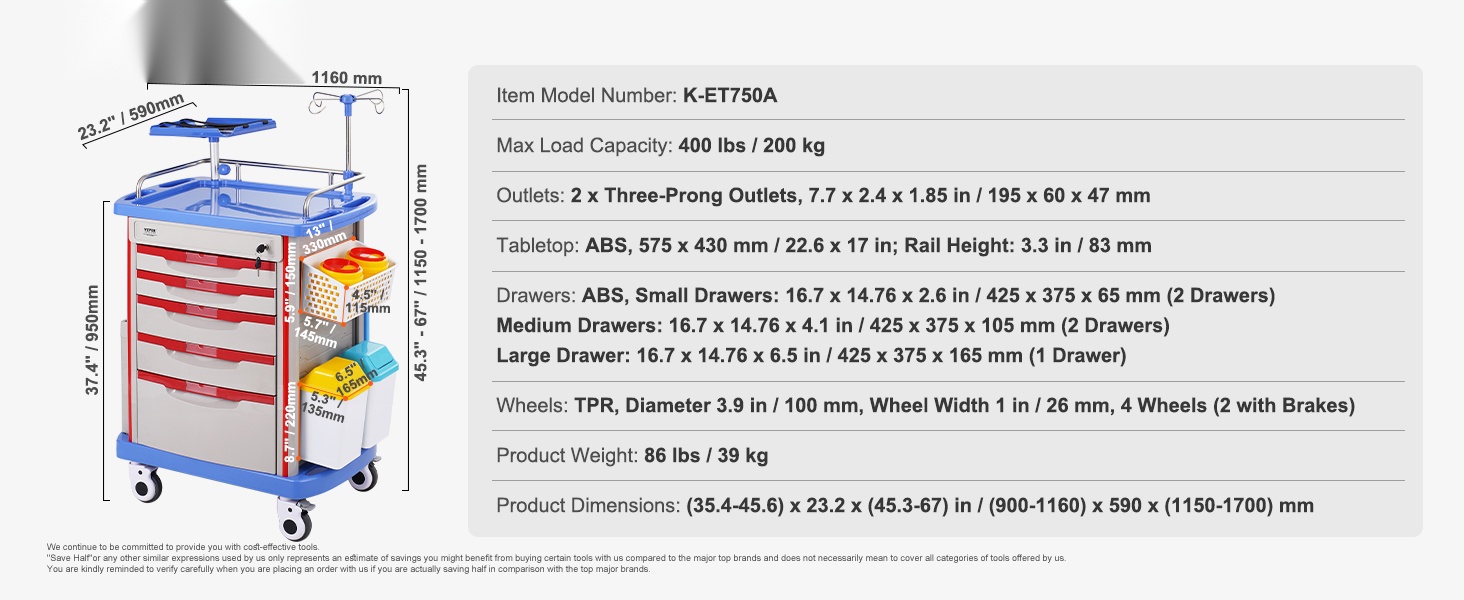 - Pyörät: TPR, halkaisija 3.9 tuumaa / 100 mm, pyörän leveys 1 tuuma / 26 mm, 4 pyörää (2 jarrulla)