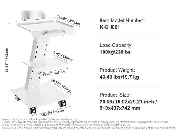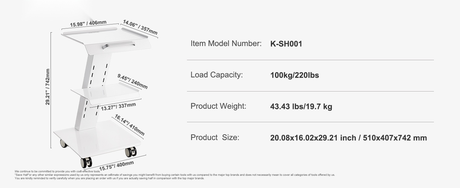 Vankka teräs- ja rautarunko tarjoaa hyvän vakauden ja kantavuuden aina 220 lbs asti. Valkoinen maalipinta auttaa suojaamaan ruostumiselta ja kulumiselta, mikä pidentää vaunun käyttöikää.