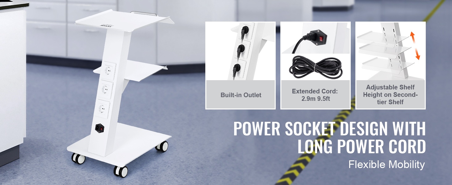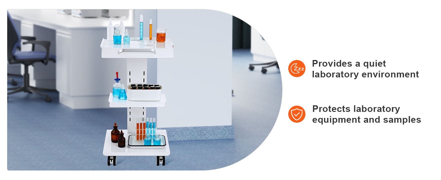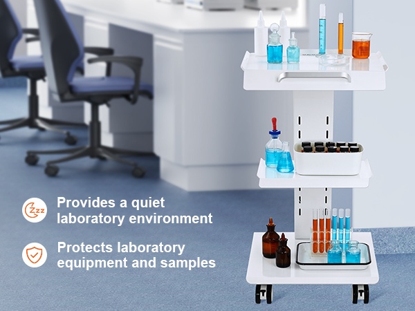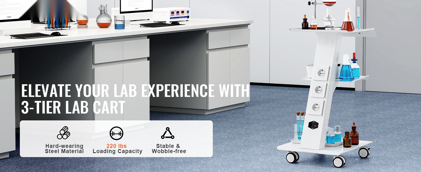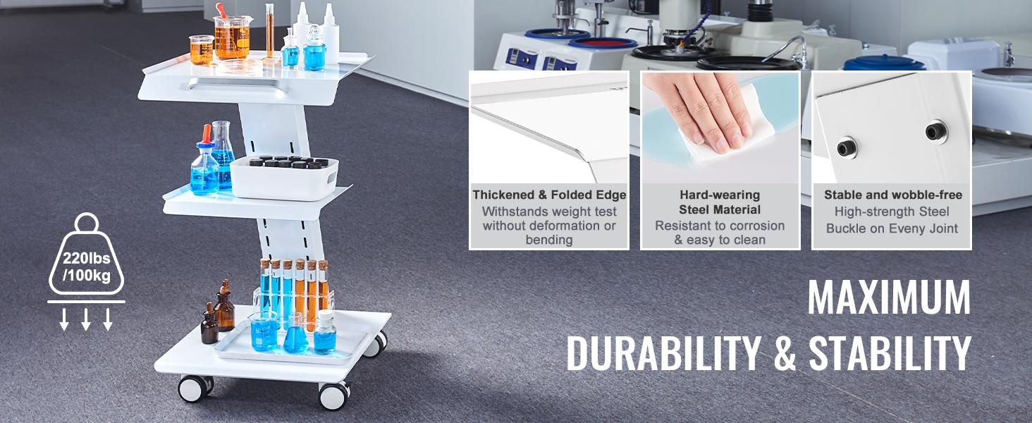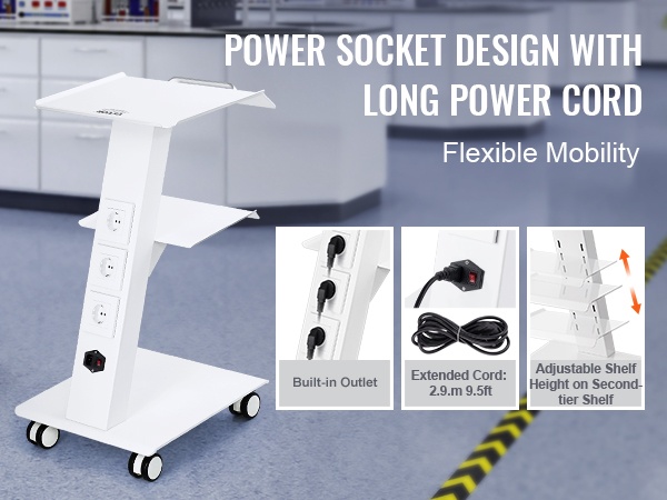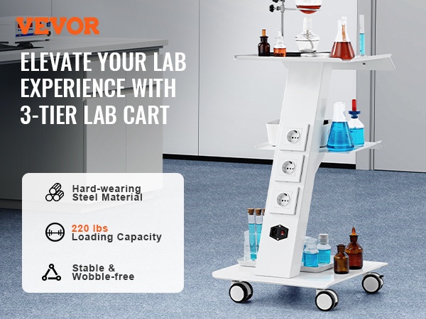 Tukeva, kolmitasoinen metallinen laboratoriovaunu helpottaa laitteiden ja tarvikkeiden siirtämistä laboratoriossa, klinikalla, kauneushoitolassa tai salonkikäytössä. Enintään 100 kg / 220 lbs kantavuus, 4 kääntyvää pyörää ja sisäänrakennettu pistorasia tekevät käytöstä joustavaa ja turvallista.
