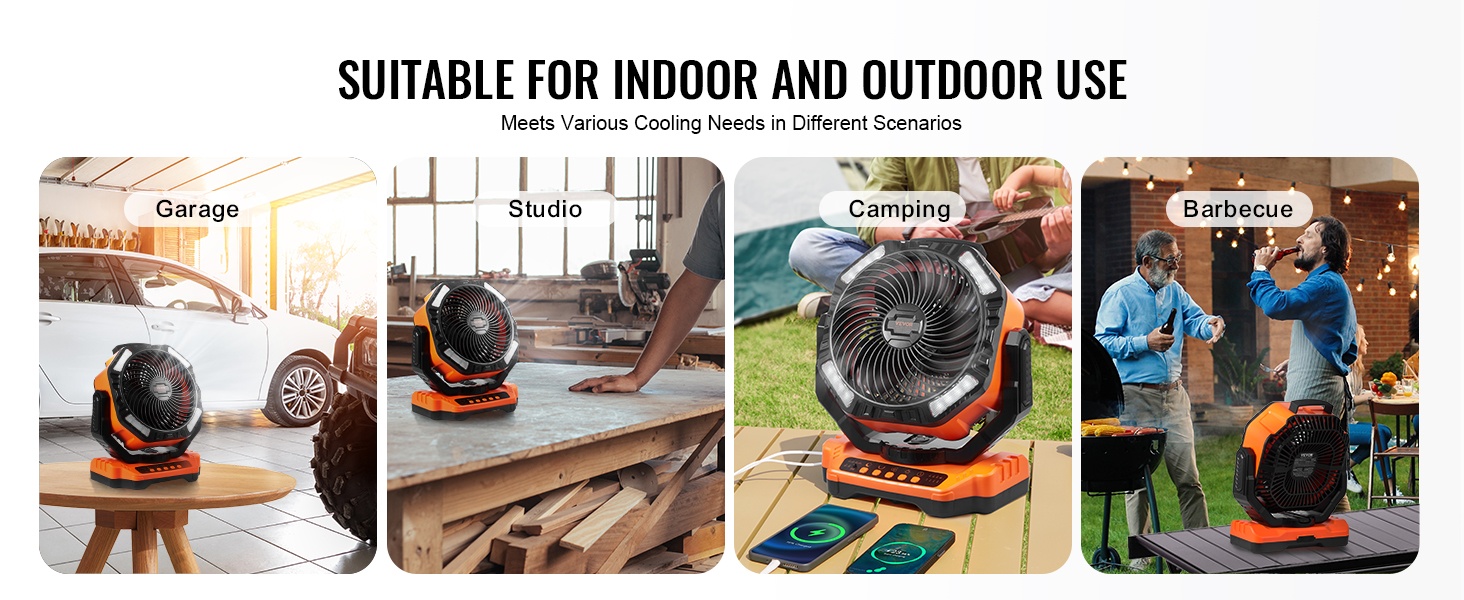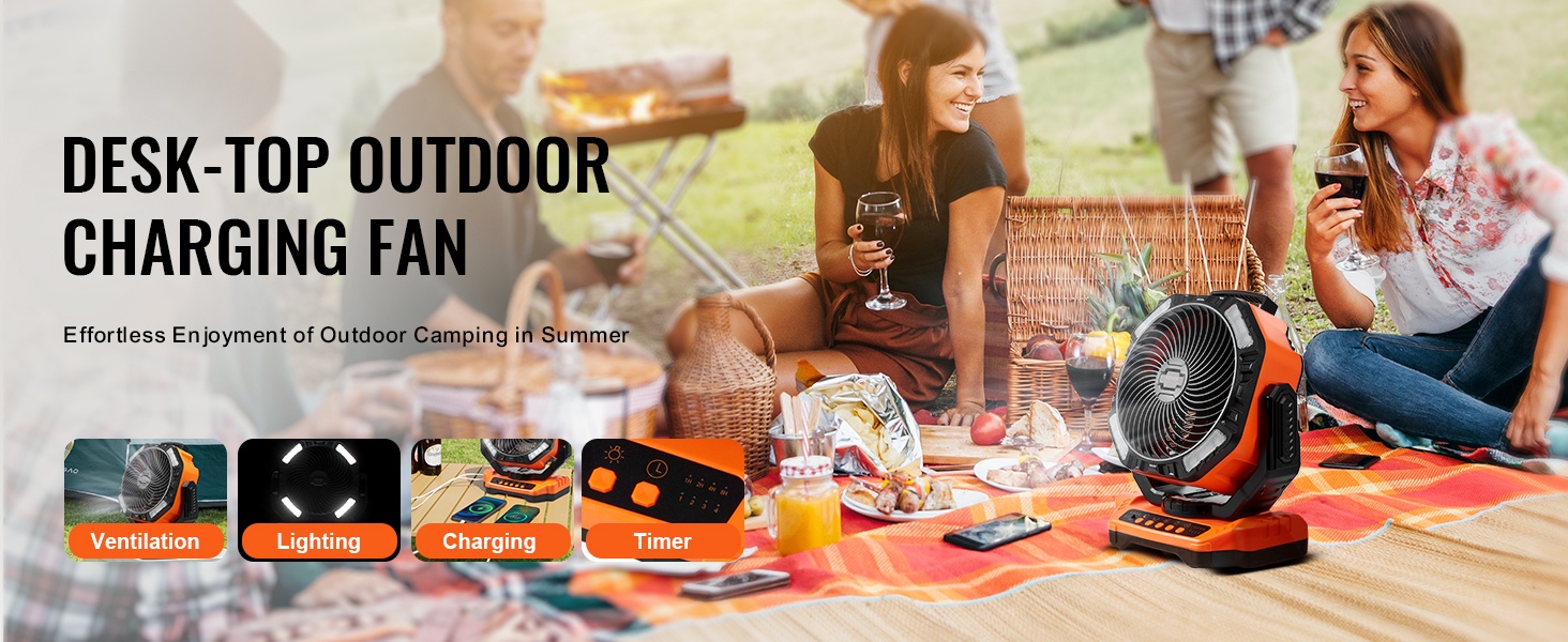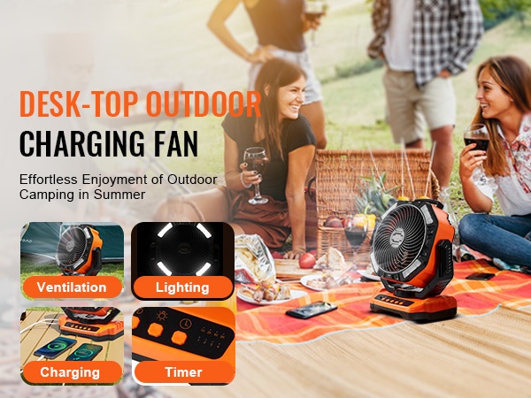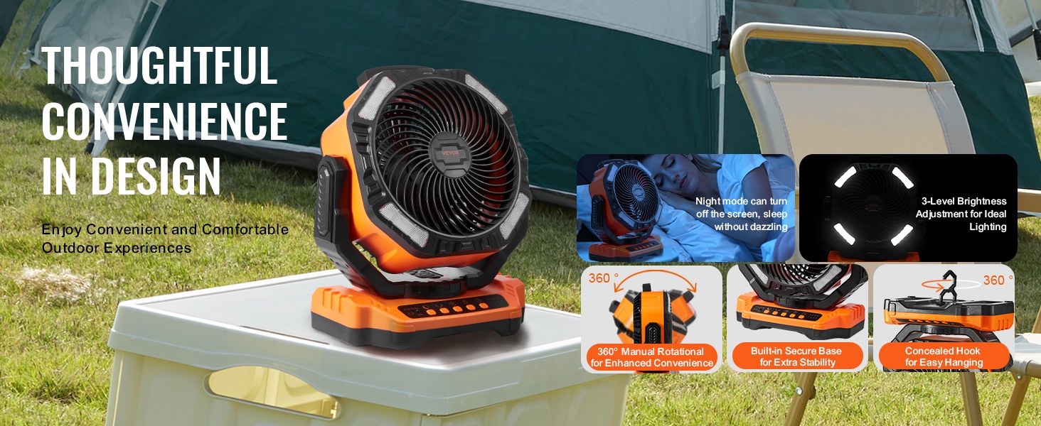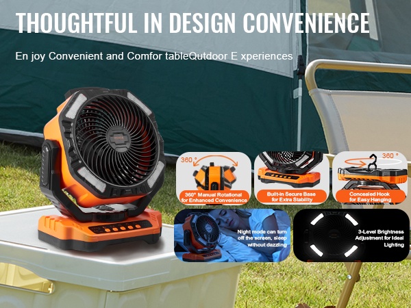 Tuuletin perustuu aerodynaamisesti vakaaseen rakenteeseen, ja se yhdistää ilmanvaihdon, valaistuksen ja latauksen yhteen laitteeseen. Sen kompakti koko ja kantokelpoinen muoto tekevät siitä käytännöllisen valinnan leirintään, terassille, matkoille ja kotiin.